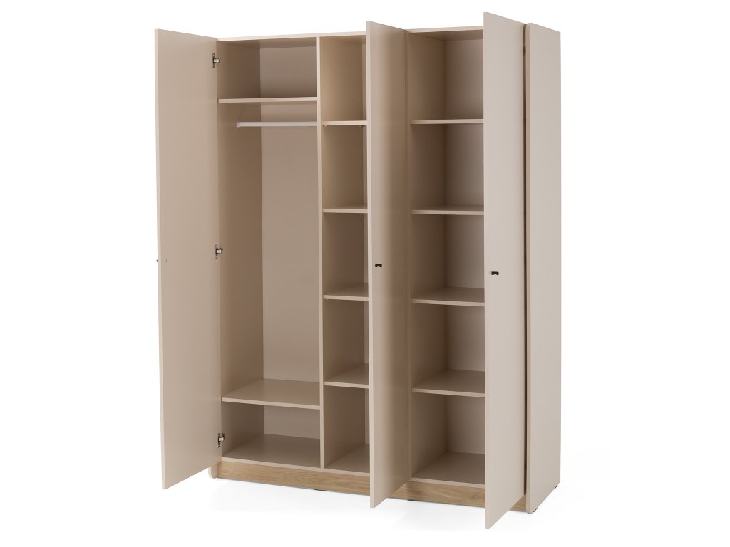 Stílusos és praktikus tároló helyet keres? Akkor bemutatnánk Önnek az Alessio AE1 elegáns bézs színű háromajtós ruhásszekrényt, amely tökéletes választás minden otthonba. Ez a minőségi gardróbszekrény 16 mm vastag laminált bútorlapból készül, amely garantálja a hosszú élettartamát és a mindennapos használat melletti ellenálló képességét. A szekrény élei ABS furnérral biztosítottak, amely még inkább véd a sérülésektől. A bézs színének köszönhetően a szekrény könnyen kombinálható más bútor elemekkel. A minimalista fém fogantyúk biztosítják a szekrény modern kinézetét és segítenek az ajtók kinyitásánál.