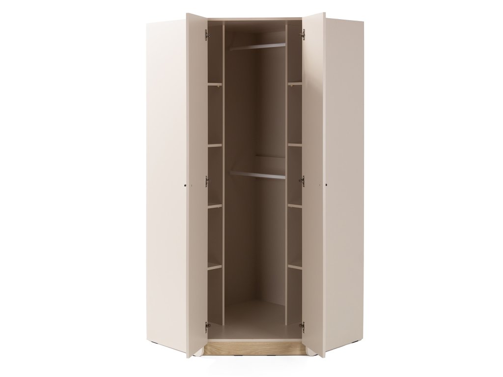 Az ALESSIO AE2 sarokszekrény ideális választás mindazok számára, akik szeretnék jól kihasználni a rendelkezésre álló helyet a gyerekszobában vagy a hálószobában. Ez a stílusos bézs színű sarok ruhásszekrény nem csak elegendő helyet biztosít, de modern designja is feldobja a szobát. Az egész belső elrendezése nagyon jól átgondolt. Három részre van osztva, amelynek köszönhetően effektíven el tudja rendezni a ruháit. Az oldalaiban négy tágas polc helyezkedik el. A középső mély részben két nagy akasztórúdat helyeztek el, ahová felakaszthatja a ruhákat és a kabátokat.
