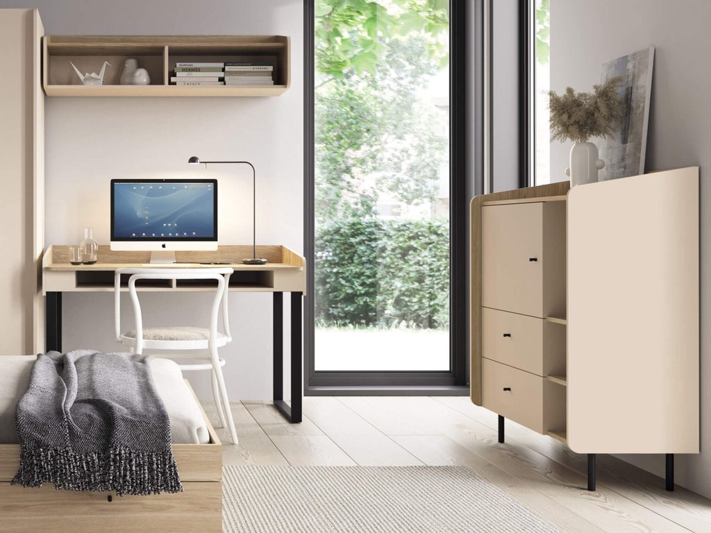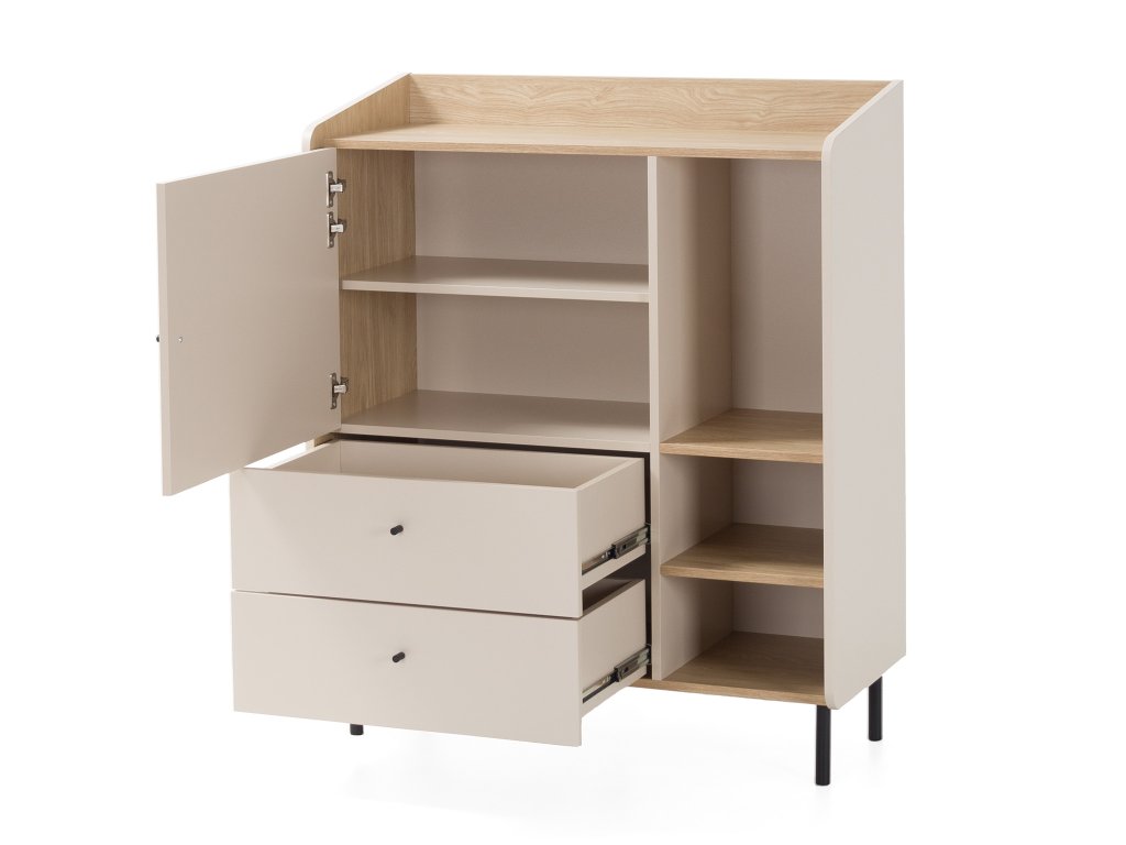 Az ALESSIO AE9 komód fekete fém fogantyúi és lábai egy igazi kecses darabbá varázsolják. Olajozott tölgy és bézs szín kombinációjában készül a nappaliba, a hálószobába vagy a gyerekszobába. Ezt a bútort úgy tervezték, hogy egy esztétikus, vonzó, de rendkívül ellenálló és praktikus is legyen. A stabil szerkezete és a minőségi megmunkálása garantálja a hosszú élettartamát. Számos tároló helyet biztosít a két tágas fióknak, a két ajtós szekrénynek és a nyitott polcoknak köszönhetően. Ez a bézs komód tökéletes választás minden otthonba. A fekete fém lábai biztosítják a stabilitását.