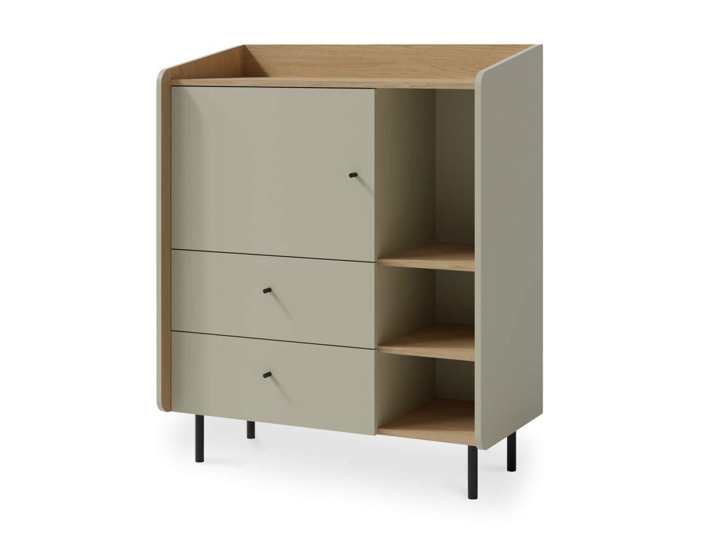 Két ajtós szekrénnyel, nyitott polcokkal és fiókokkal is rendelkező praktikus komód