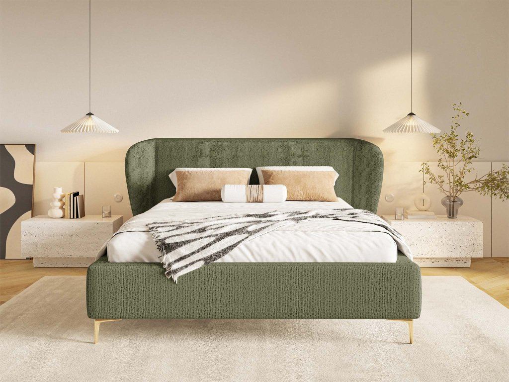 Az Aliano kárpitozott franciaágy 160×200 cm-es méretben, friss zöld színben természetes harmóniát és modern stílust visz a hálószobába. A puha, lekerekített fejtámla kényelmes támaszt nyújt pihenés, olvasás vagy tévénézés közben, míg a finom kárpitozás otthonos és luxus megjelenést kölcsönöz az ágynak. A zöld árnyalat harmonikus és elegáns, aminek köszönhetően az ágy bármely beltér domináns, mégis ízléses elemévé válik. A karcsú arany lábak optikailag könnyítik a bútort és hangsúlyozzák annak kifinomult karakterét, miközben a stabil szerkezet hosszú távú tartósságot és kényelmes alvást garantál.