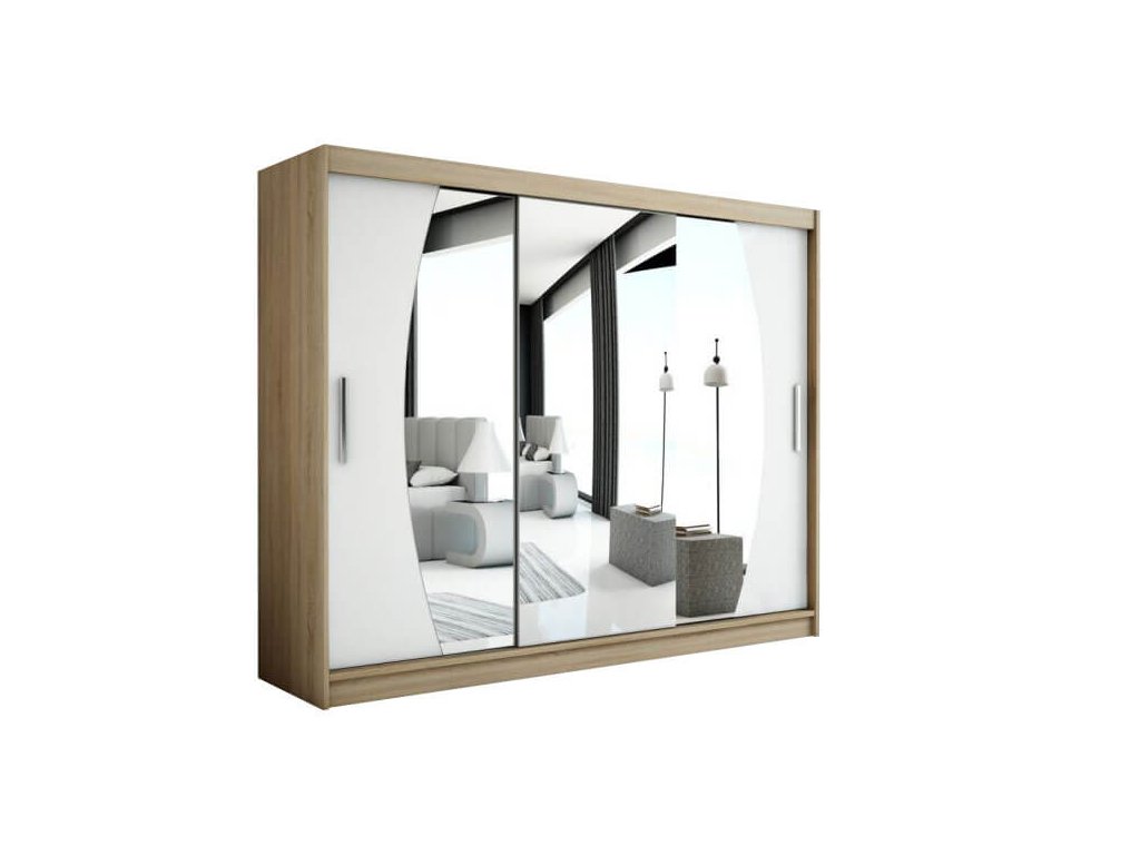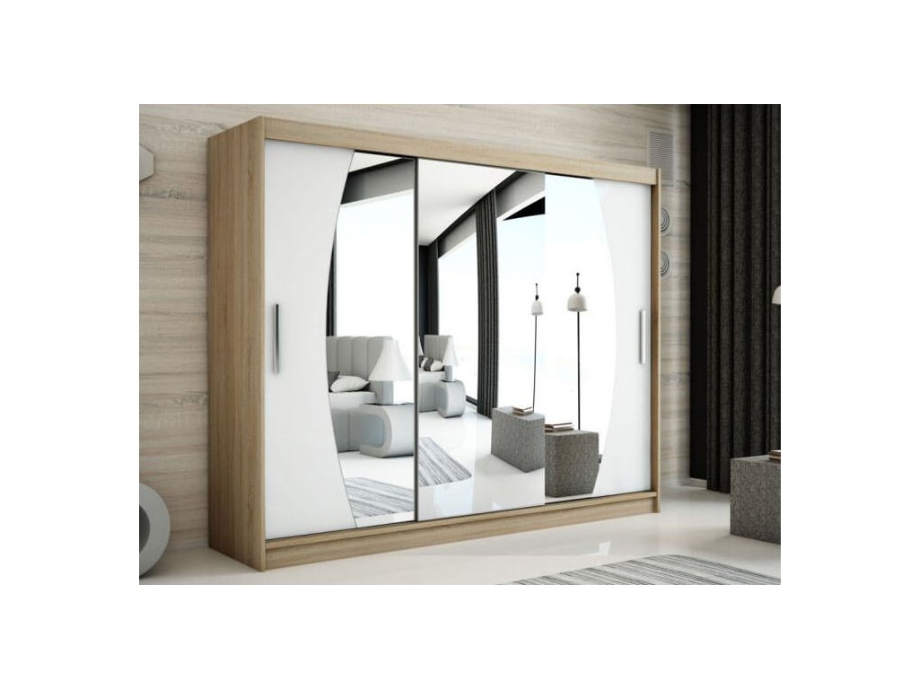 Az ALIAS 250 ruhásszekrény rendkívül praktikus tároló bútor sonoma tölgy és fehér színkombinációban. A tükrös szekrény 16 mm vastag laminált bútorlapból gyártott, PVC furnérral borított minőségi bútor, amely nélkülözhetetlen az Ön hálószobájából, előszobájából vagy a folyosóról. A gondos odafigyeléssel készült gardróbszekrény tökéletesen ellenáll a párának, a magas hőmérsékletnek és a kisebb karcolódásoknak is. Az ajtók fémsínen gurulva, a "BIMAK" tolóajtó rendszer segítségével nyílnak és záródnak. A szekrény belseje három részre tagolt. Középen két akasztórúd található és egy széles polc. A gardrób jobb és bal oldalán pedig négy-négy polc, összesen öt-öt tároló rekesz biztosítja a ruházat esztétikus elrendezését.