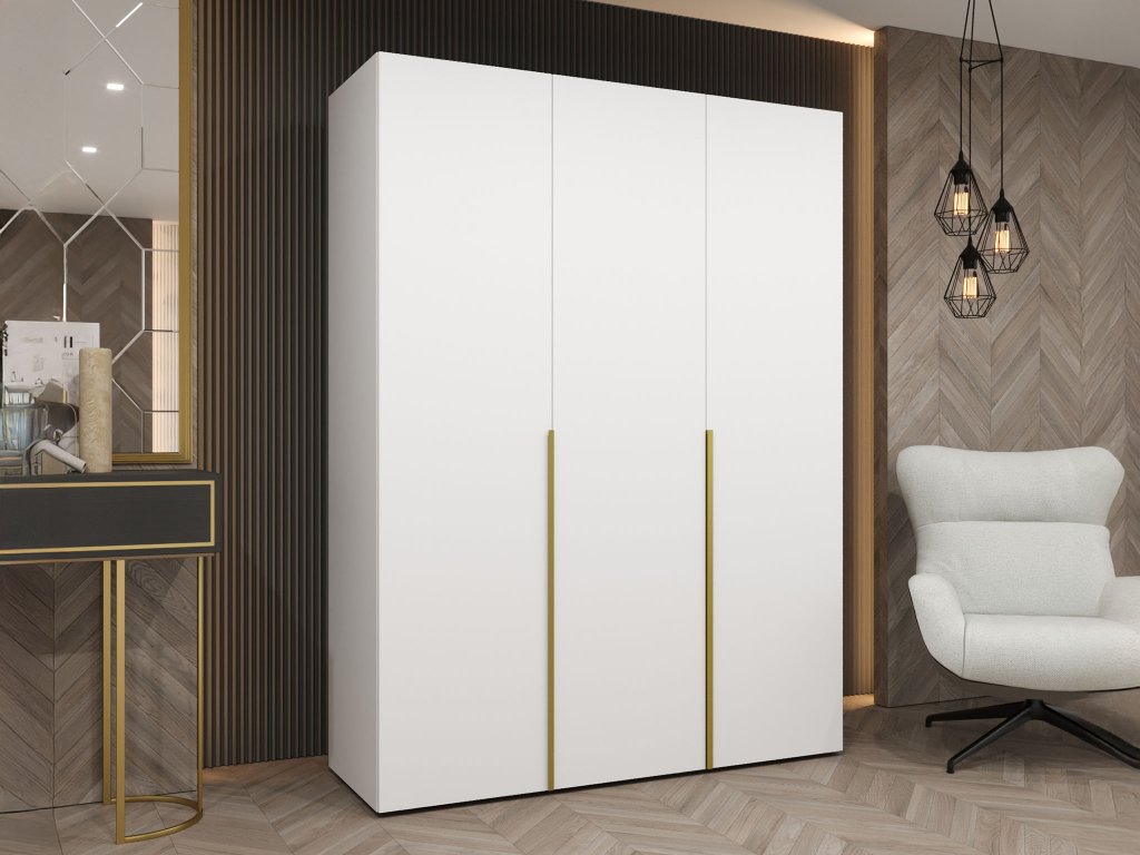 Az Alicante 1 gardróbszekrény stílusos és praktikus megoldás bármilyen enteriőrbe. Kiválóan illik hálószobába, előszobába, dolgozószobába vagy akár gyerekszobába is. Modern, fehér színű dizájnjának köszönhetően bárhová könnyedén beilleszthető. A szekrény minőségi, laminált bútorlapból készült, amely karcálló és egyszerűen tisztán tartható. Felülete nem őrzi meg az ujjlenyomatokat. Az éleket erős PVC élzárás védi, ami növeli a bútor élettartamát. A matt felületet elegáns, aranyszínű alumínium fogantyú egészíti ki, amely egyszerre kölcsönöz luxust és praktikusságot a szekrénynek. A belső tér fém akasztórudakat kínál ruhák felakasztásához, valamint masszív polcokat minden fontos holmi átlátható tárolásához. Előnye még a lágy záródású ajtó, amely halk, egyenletes működést biztosít, zavaró zajok nélkül.