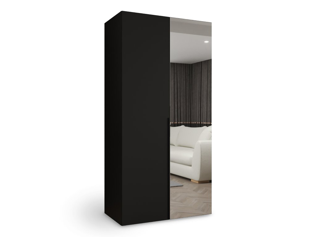 A kétszárnyú Alicante 2 gardróbszekrény 100 cm-es szélességgel tökéletesen ötvözi a modern dizájnt a praktikus tárolóhellyel. Könnyedén beilleszthető otthonának bármely helyiségébe – legyen szó hálószobáról, előszobáról, dolgozószobáról vagy akár gyerekszobáról. Ez a szekrény strapabíró laminált bútorlapból készül, matt fekete felülete pedig igazán elegáns megjelenést kölcsönöz a bútornak. Minden élét PVC borítás védi, amely óvja a szekrényt a sérülésektől és jelentősen növeli az élettartamát. Esztétikus és praktikus részlet a fekete alumínium fogantyú, amely finom luxusérzetet ad a szekrénynek. Az egyik ajtón elhelyezett beépített tükör tovább fokozza a funkcionalitást. A belső térben fém akasztórúd található a ruhák felakasztásához, valamint egy masszív polc, amely ideális a szezonális ruhák, kiegészítők vagy dobozok átlátható tárolására. Az átgondolt belső elrendezésnek köszönhetően mindig rend és átláthatóság uralkodik a szekrényben. Külön kényelmet jelent a finoman és csendesen záródó ajtók használata.