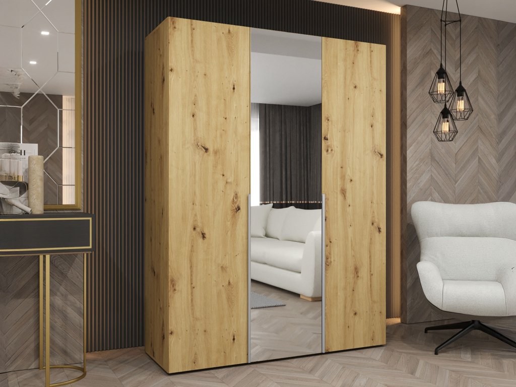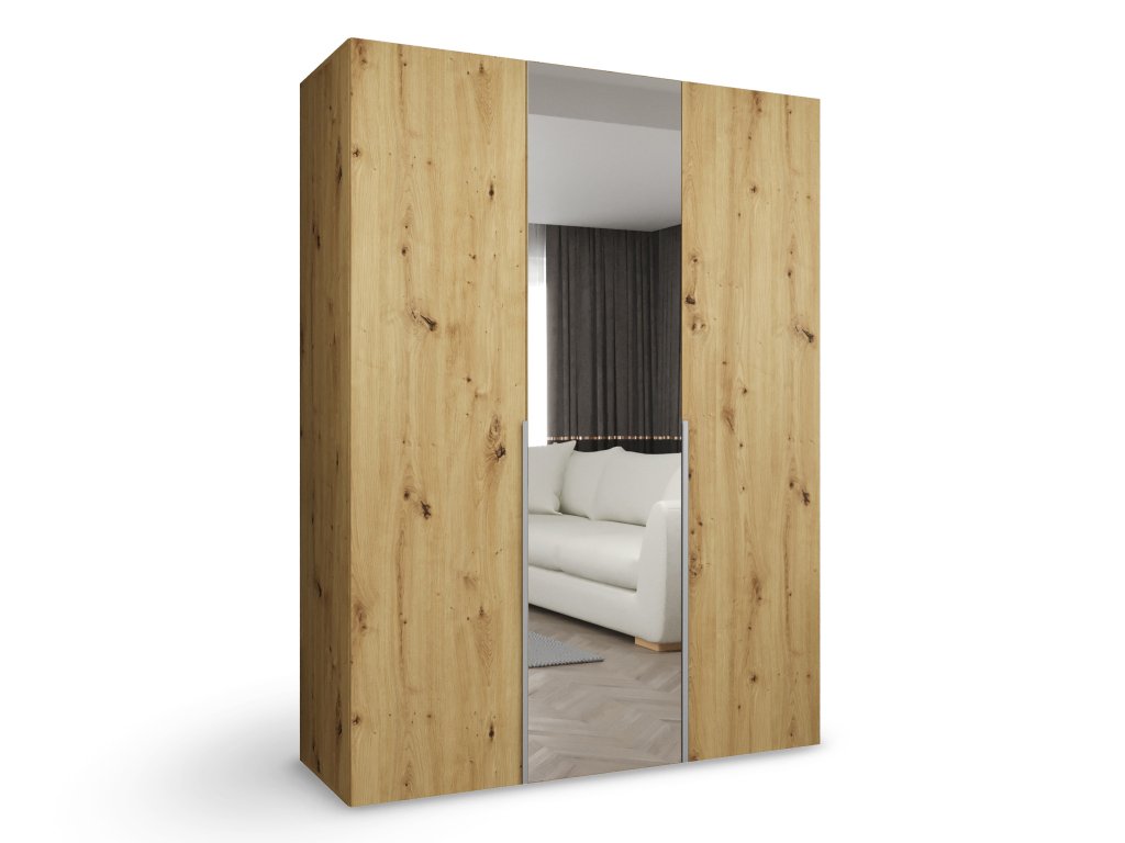 Az Alicante 2 gardróbszekrény 150 cm-es méretben elegáns bútordarab, amely univerzális stílusának köszönhetően könnyedén beilleszthető különböző típusú enteriőrökbe, például hálószobába, előszobába vagy akár gyerekszobába is. Matt felületű, artisan tölgy dekorral rendelkezik. A laminált szerkezet tartós, könnyen tisztán tartható, és a mindennapi használatot is jól bírja. A PVC élek extra védelmet nyújtanak a kopással szemben, így meghosszabbítják a bútor élettartamát. A stílusos kasmír színű alumínium fogantyú kiemeli a szekrény kifinomult dizájnját, emellett kényelmes nyitást tesz lehetővé. A szekrény praktikus eleme a beépített tükör. A belső tér átláthatóan van kialakítva: fém akasztórudak biztosítanak helyet a ruhák felakasztásához, a masszív polcok pedig elegendő helyet kínálnak szezonális ruhaneműk, dobozok, kiegészítők vagy rendszerezők számára. Az Ön kényelme érdekében a gardróbszekrény csendes záródást biztosító mechanizmussal van ellátva, így az ajtók mindig finoman és zajtalanul csukódnak.
