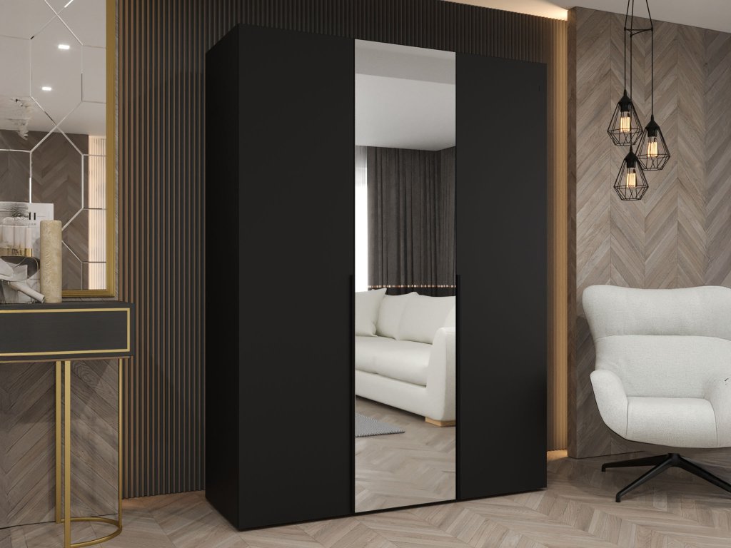 Az Alicante 2 gardróbszekrény 150 cm-es szélességével a praktikum és a modern dizájn tökéletes kombinációja. Időtálló megjelenésének és letisztult vonalainak köszönhetően könnyedén beilleszthető bármelyik helyiségbe – legyen az hálószoba, előszoba, dolgozószoba vagy akár gyerekszoba. A szekrény kiváló minőségű laminált lapból készül, amely egyszerűen tisztán tartható, miközben elegáns hatást kelt. A matt fekete felület kifinomult akcentust ad a berendezésnek. Az éleket PVC élzárás védi, mely ellenállóbbá teszi a bútort a sérülésekkel szemben. A design részletek sorát a fekete alumínium fogantyú gazdagítja, amely luxus érzetet és modern karaktert kölcsönöz a szekrénynek. Az ajtókon elhelyezett praktikus tükör optikailag tágítja a helyiséget, és a mindennapi öltözködéshez is hasznos segítséget nyújt. A belső tér átgondolt kialakítása bőséges tárolóhelyet kínál: megtalálható benne fém akasztórúd a ruhák felakasztásához, valamint masszív polcok kiegészítők, szezonális ruhanemű vagy tárolódobozok elhelyezésére. A mindennapi kényelmet a csendes, finoman záródó ajtók biztosítják, amelyek használata rendkívül halk és gördülékeny.