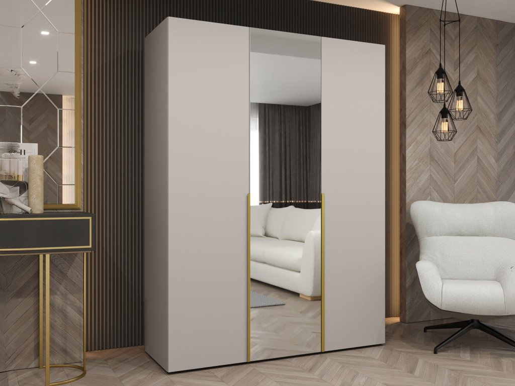 Az Alicante 2 gardróbszekrény 150 cm-es szélességgel az időtlen megjelenést ötvözi a praktikus tárolóhellyel. Formatervezésének és letisztult, univerzális vonalainak köszönhetően könnyedén beilleszthető hálószobába, előszobába, dolgozószobába vagy akár gyerekszobába is. A szekrény strapabíró laminált lapból készül, amely nemcsak elegáns hatást kelt, de könnyen tisztán tartható is. Matt kasmír felülete stílusos karaktert ad a helyiségnek. Az éleket PVC élzárás védi, amely növeli az ellenállóképességet a sérülésekkel szemben. Az aranyszínű alumínium fogantyú finoman fokozza a bútor eleganciáját és finom luxusérzetet kölcsönöz neki. Az ajtón elhelyezett tükör optikailag tágítja a teret, és praktikus segítséget nyújt öltözködéskor. A belső tér fémből készült akasztórudakat és masszív polcokat rejt, amelyek ideálisak szezonális ruhák, kiegészítők vagy rendszerezők tárolására. A mindennapi használat kényelméről a csendes záródású ajtók gondoskodnak.