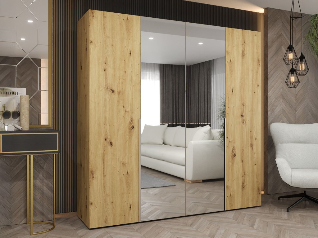 Stílusos megjelenésre és bőséges tárolóhelyre vágyik? Ideális választás az a garnitúra, amely két darab Alicante 2 gardróbszekrényből áll, egyenként 100 cm szélességgel. Ez a két szekrény együtt egy tágas, funkcionálisan kialakított bútort alkot, amely kiválóan illeszkedik többféle helyiségbe – legyen szó hálószobáról, dolgozószobáról vagy gyerekszobáról. A szekrény artisan tölgy dekorral és matt felülettel készül, így könnyedén kombinálható más bútorokkal. A laminált lap nemcsak esztétikus, hanem praktikus is: ellenáll a kopásnak, és könnyen tisztán tartható. Az éleket védő PVC élzárás tovább növeli az élettartamot és hatékonyan óvja a bútort az ütések ellen. Az egyik ajtón beépített tükör található. A kasmír színű alumínium fogantyúk elegáns részletként emelik ki a bútor összhatását. A belső elrendezés praktikus megoldásokat kínál: a fém akasztórudak és a masszív polcok átlátható rendszerezést tesznek lehetővé, legyen szó ruhákról, szezonális darabokról vagy kiegészítőkről. Az ajtók halk, finom záródása pedig minden nap kényelmes használatot garantál.