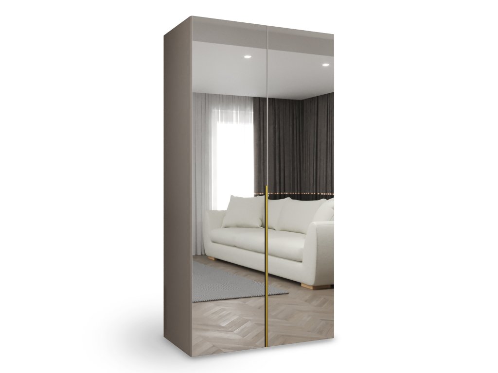 - Anyag: laminált DTD lap, 16 mm-es élek, 0,5 mm-es PVC furnér, arany alumínium fogantyúk, csiszolt tükör