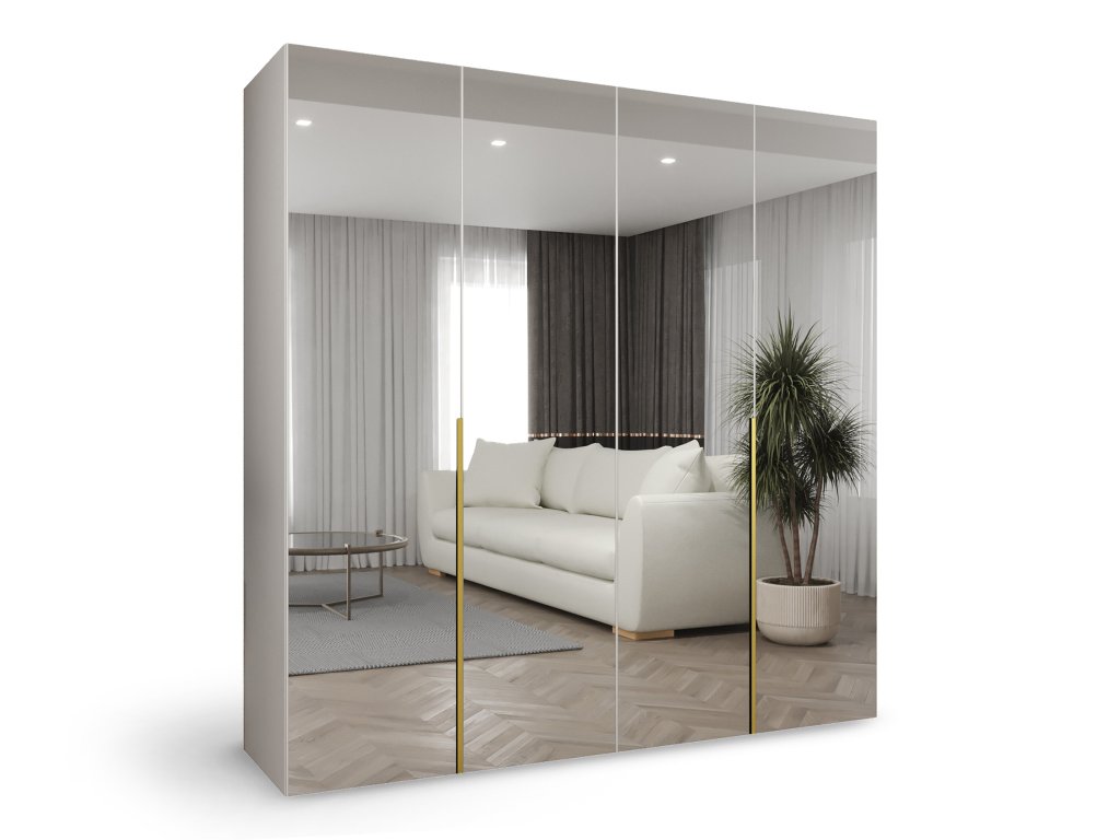 - Anyag: laminált DTD lap, 16 mm-es élek, 0,5 mm-es PVC furnér, arany alumínium fogantyúk, csiszolt tükör