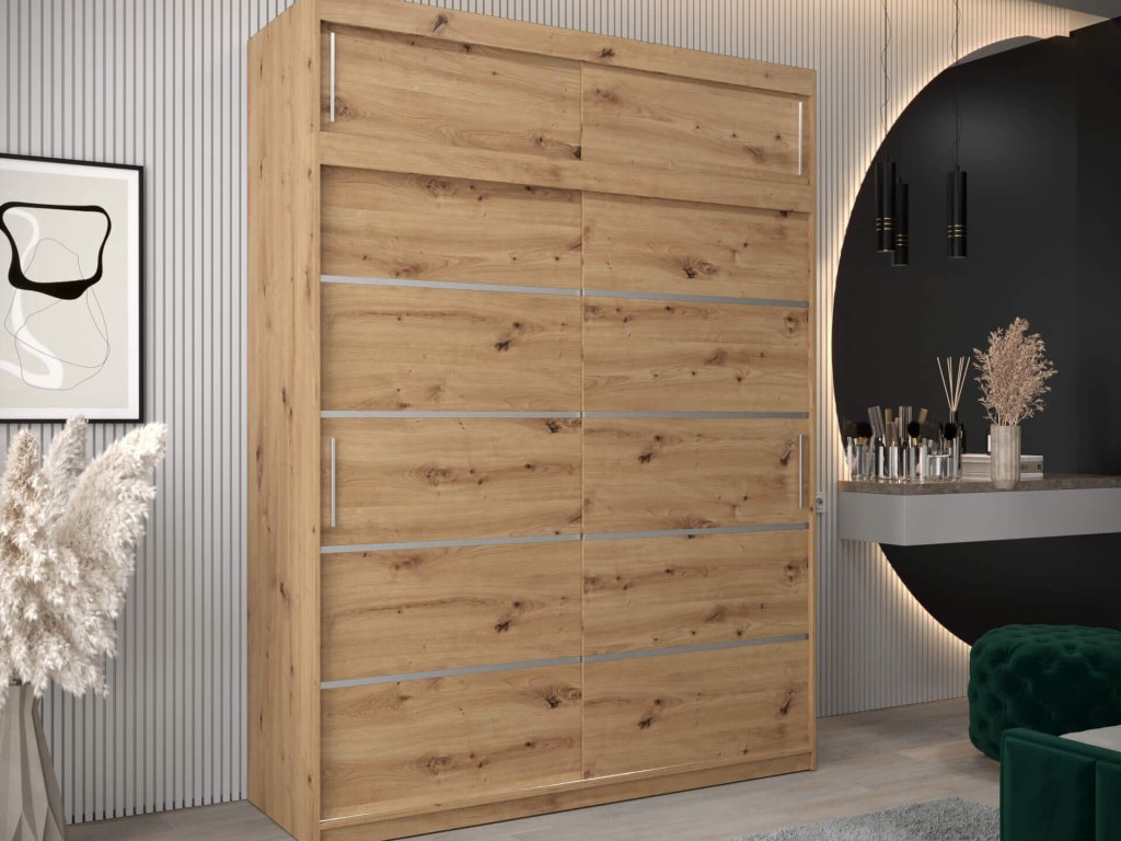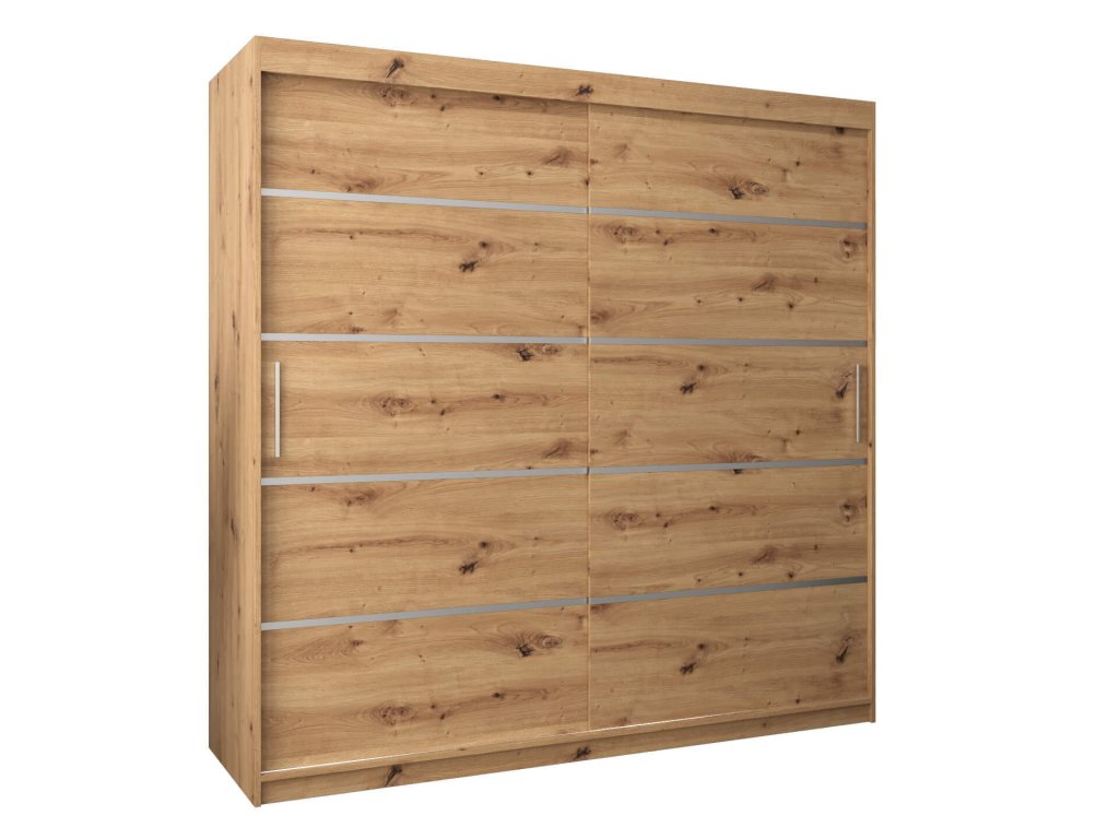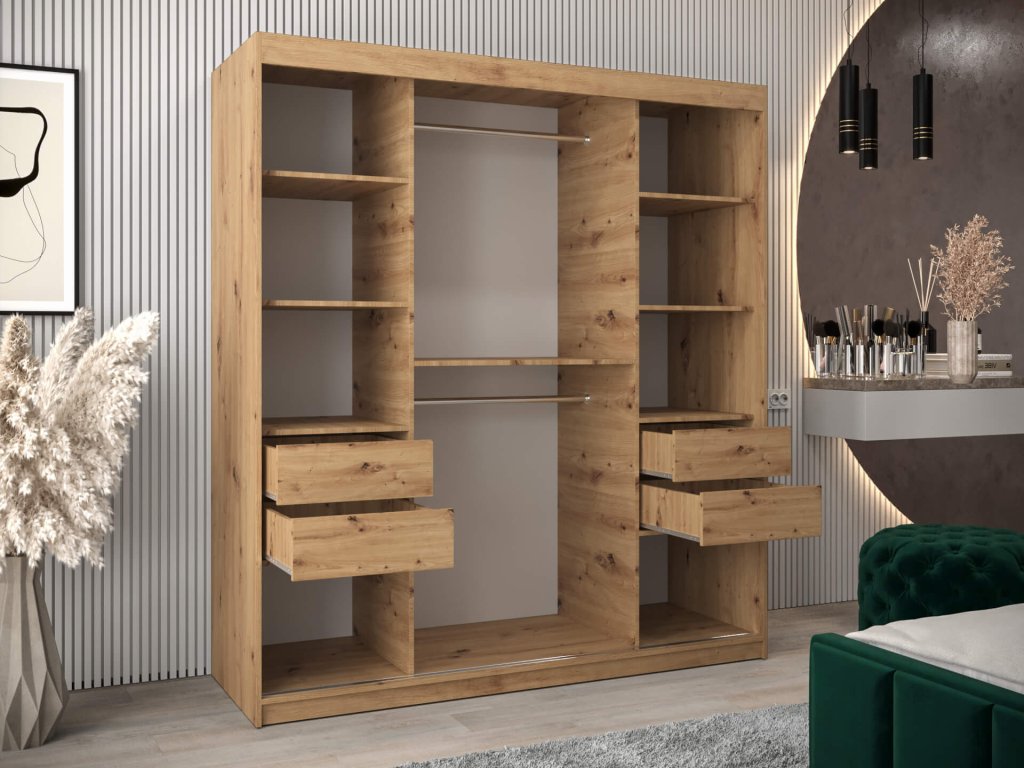 A modern és tágas ALYXIA 180/200 artisan tölgy gardróbszekrény minőségi 16 mm vastag laminált bútorlapból (DTD) készül, amely ellenálló a karcolásokkal, a nedvességgel és a magas hőmérséklettel szemben. A szekrény szélei ABS élzárással vannak biztosítva. Az ajtók kényelmes kinyitását és becsukását a ,,BIMAK” tolóajtó rendszer biztosítja (fémsíneken). A szekrény három részre van osztva. A ruhásszekrény közepén a két akasztórúd elegendő tárolóhelyet biztosít, a jobb és a bal szélében lévő négy polc pedig áttekinthetővé teszi a ruhákat. A modern gardróbszekrény tökéletes választás a hálószobába, a folyosóra vagy az előszobába is.