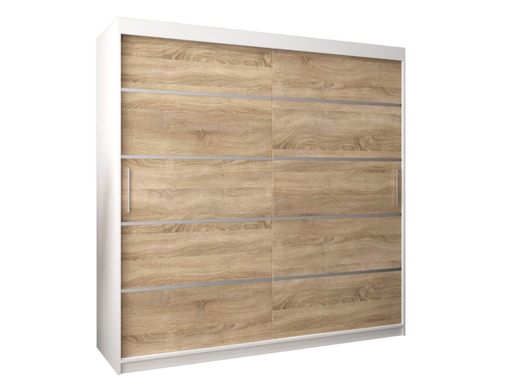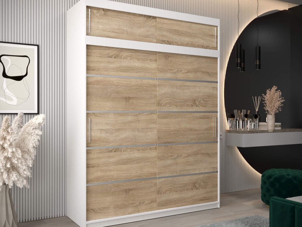 Tágas és modern ALYXIA 180/200 sonoma tölgy és fehér szín kombinációjában készült gardróbszekrény. A ruhásszekrény minőségi 16 mm vastag laminált bútorlapból (DTD) készül, amely ellenálló a karcolásokkal, a nedvességgel és a magas hőmérséklettel szemben. A szekrény szélei ABS élzárással vannak biztosítva. Az ajtók kényelmes kinyitását és becsukását a ,,BIMAK” tolóajtó rendszer biztosítja (fémsíneken). A szekrény három részre van osztva. A ruhásszekrény közepén a két akasztórúd elegendő tárolóhelyet biztosít, a jobb és a bal szélében lévő négy polc pedig áttekinthetővé teszi a ruhákat. A modern gardróbszekrény tökéletes választás a hálószobába, a folyosóra vagy az előszobába is.