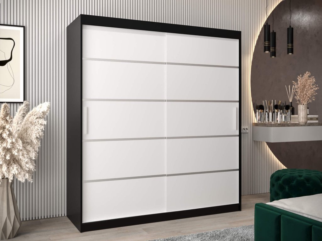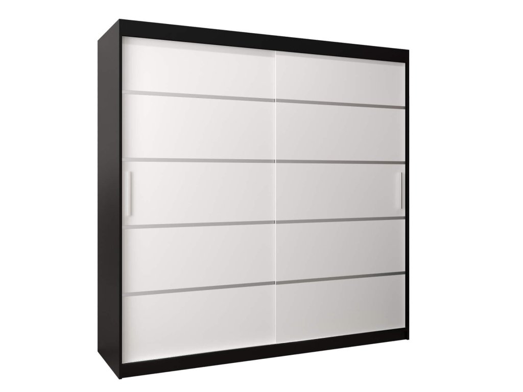 Fekete - fehér ALYXIA 180/200 gardróbszekrény minőségi 16 mm vastag laminált bútorlapból (DTD) készül, amely ellenálló a karcolásokkal, a nedvességgel és a magas hőmérséklettel szemben. A szekrény szélei ABS élzárással vannak biztosítva. Az ajtók kényelmes kinyitását és becsukását a ,,BIMAK” tolóajtó rendszer biztosítja (fémsíneken). A szekrény három részre van osztva. A ruhásszekrény közepén a két akasztórúd elegendő tárolóhelyet biztosít, a jobb és a bal szélében lévő négy polc pedig áttekinthetővé teszi a ruhákat. A modern gardróbszekrény tökéletes választás a hálószobába, a folyosóra vagy az előszobába is.  lévő csíkokat összeszereléskor kell felragasztani. A csomagolás részét képezik.