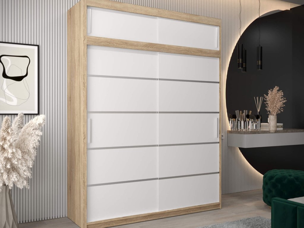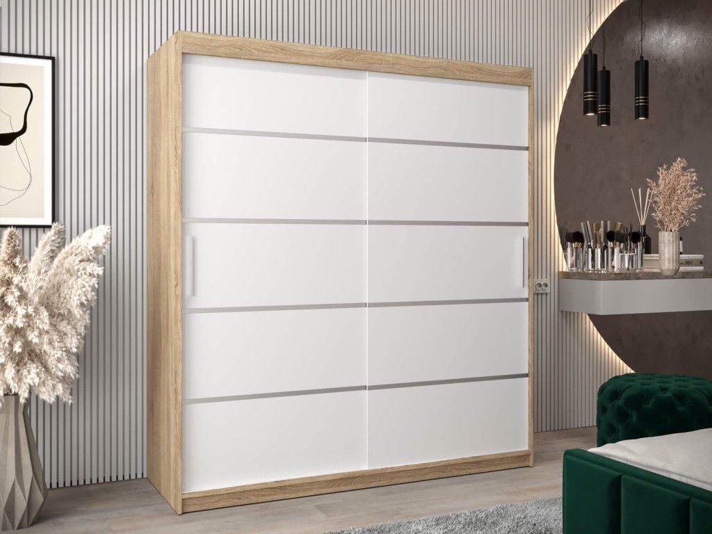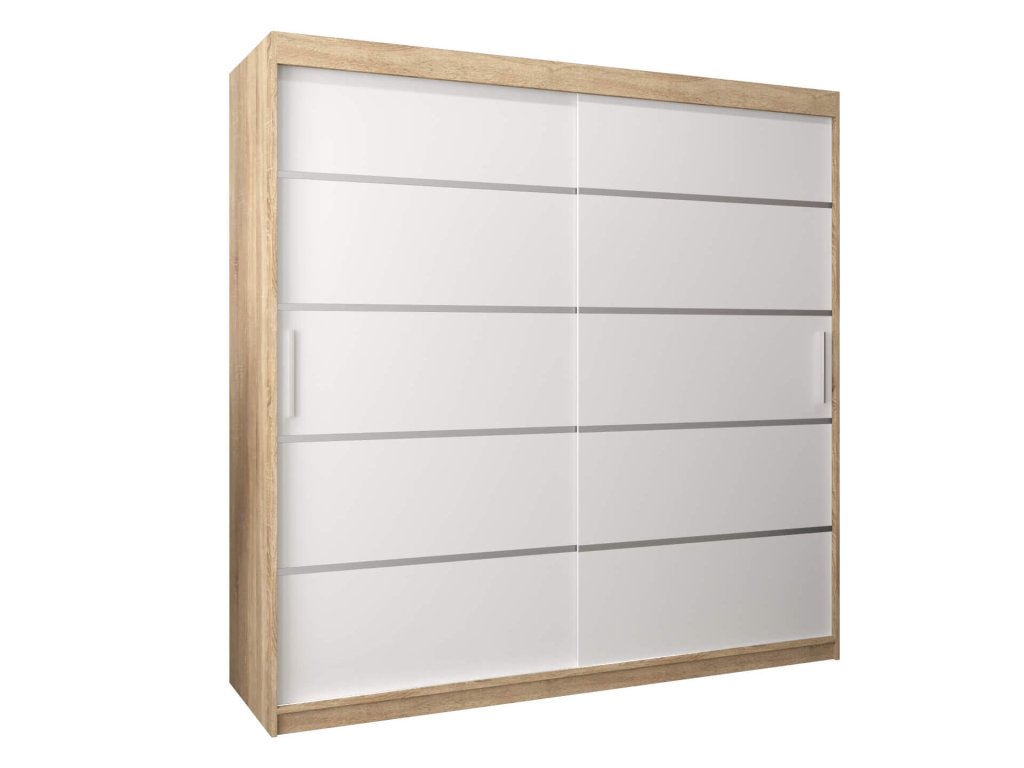 Modern két szín kombinációjában készült ALYXIA 180/200 gardróbszekrény, amely sonoma tölgy és fehér szín kombinációjában készült. A szekrény minőségi 16 mm vastag laminált bútorlapból (DTD) készül, amely ellenálló a karcolásokkal, a nedvességgel és a magas hőmérséklettel szemben. A szekrény szélei ABS élzárással vannak biztosítva. Az ajtók kényelmes kinyitását és becsukását a ,,BIMAK” tolóajtó rendszer biztosítja (fémsíneken). A szekrény három részre van osztva. A ruhásszekrény közepén a két akasztórúd elegendő tárolóhelyet biztosít, a jobb és a bal szélében lévő négy polc pedig áttekinthetővé teszi a ruhákat. A modern gardróbszekrény tökéletes választás a hálószobába, a folyosóra vagy az előszobába is.