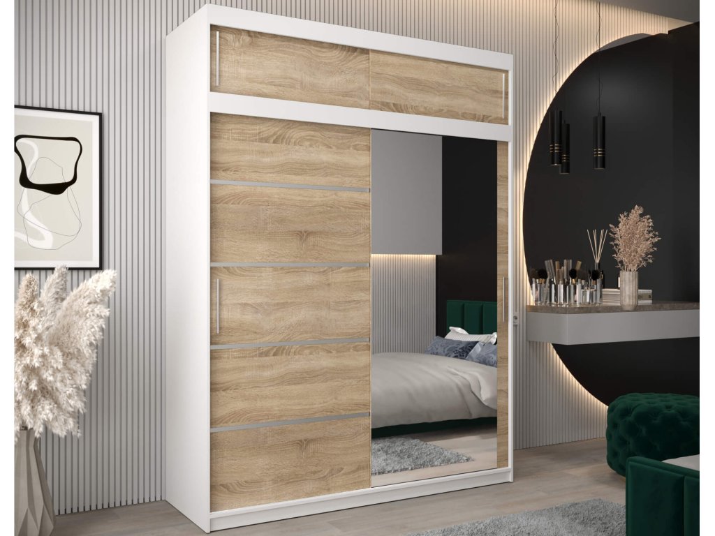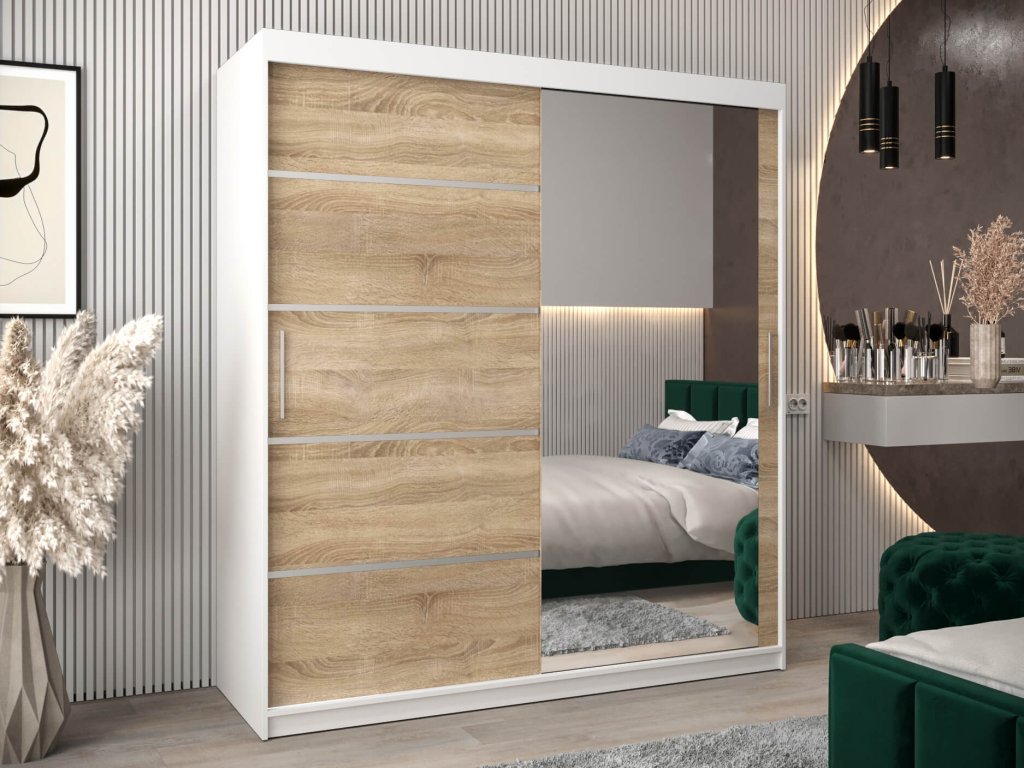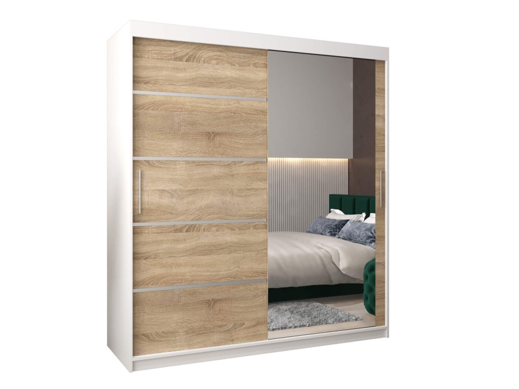 Fehér és sonoma tölgy színben készült tágas és modern ALYXIA 180/200 gardróbszekrény tükörrel. A ruhásszekrény minőségi 16 mm vastag laminált bútorlapból (DTD) készül, amely ellenálló a karcolásokkal, a nedvességgel és a magas hőmérséklettel szemben. A szekrény szélei ABS élzárással vannak biztosítva. Az ajtók kényelmes kinyitását és becsukását a ,,BIMAK” tolóajtó rendszer biztosítja (fémsíneken). A szekrény három részre van osztva. A ruhásszekrény közepén a két akasztórúd elegendő tárolóhelyet biztosít, a jobb és a bal szélében lévő négy polc pedig áttekinthetővé teszi a ruhákat. A modern gardróbszekrény tökéletes választás a hálószobába, a folyosóra vagy az előszobába is.