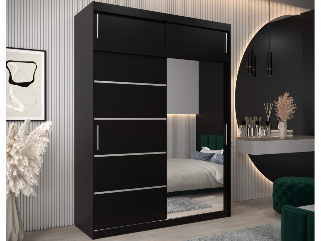 Fekete színű ALYXIA II gardróbszekrény 180/200 tükörrel számos tároló helyet kínál. Minőségi 16 mm vastag laminált bútorlapból (DTD) készül, amely ellenálló a karcolásokkal, a nedvességgel és a magas hőmérséklettel szemben. A szekrény szélei ABS élzárással vannak biztosítva. Az ajtók kényelmes kinyitását és becsukását a ,,BIMAK” tolóajtó rendszer biztosítja (fémsíneken). A szekrény három részre van osztva. A ruhásszekrény közepén a két akasztórúd elegendő tárolóhelyet biztosít, a jobb és a bal szélében lévő négy polc pedig áttekinthetővé teszi a ruhákat. A modern gardróbszekrény tökéletes választás a hálószobába, a folyosóra vagy az előszobába is.