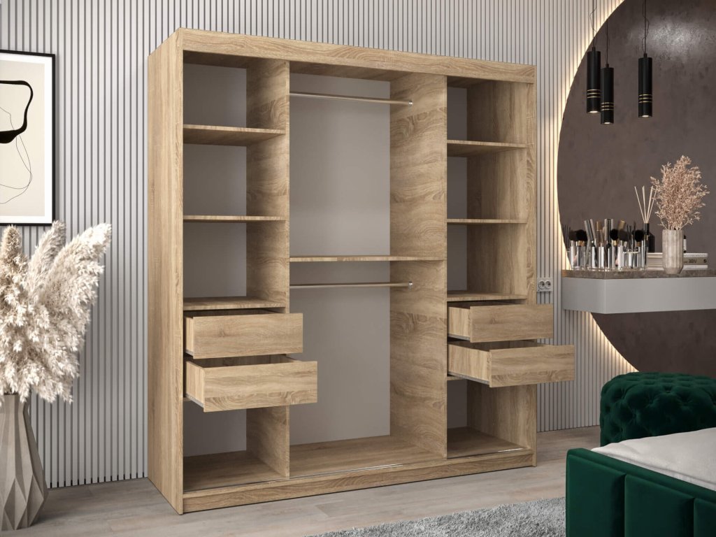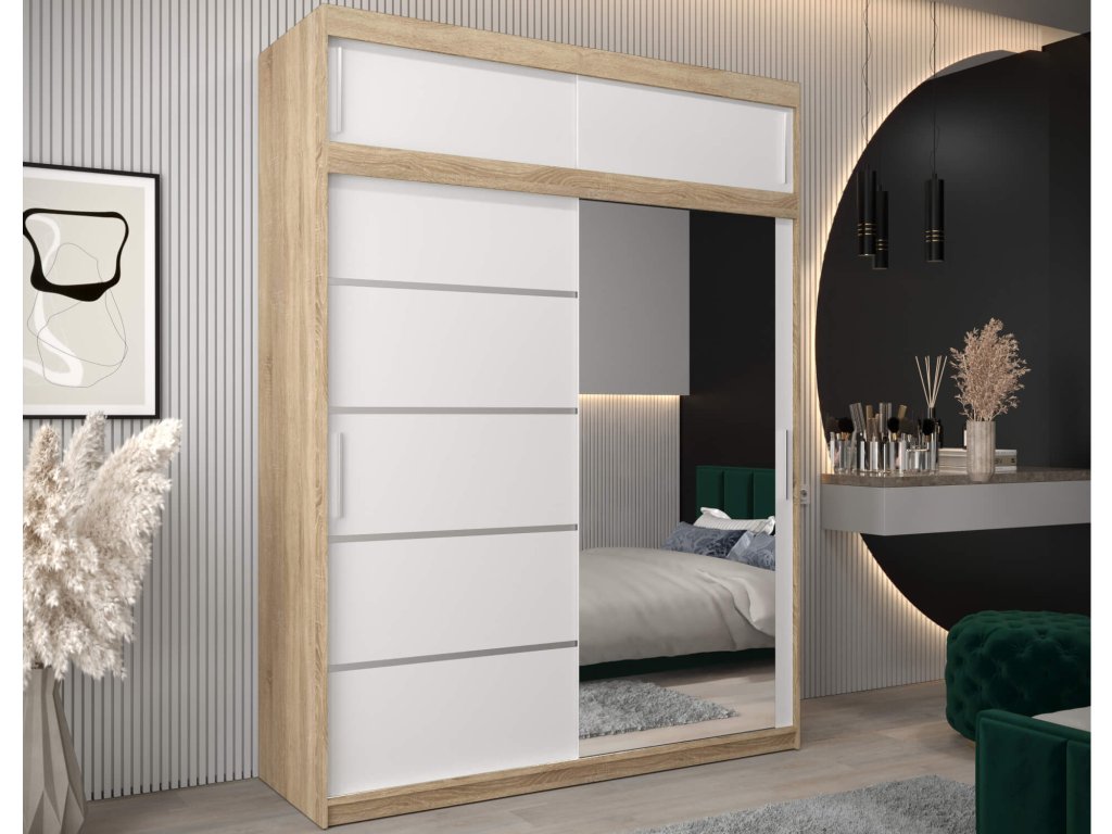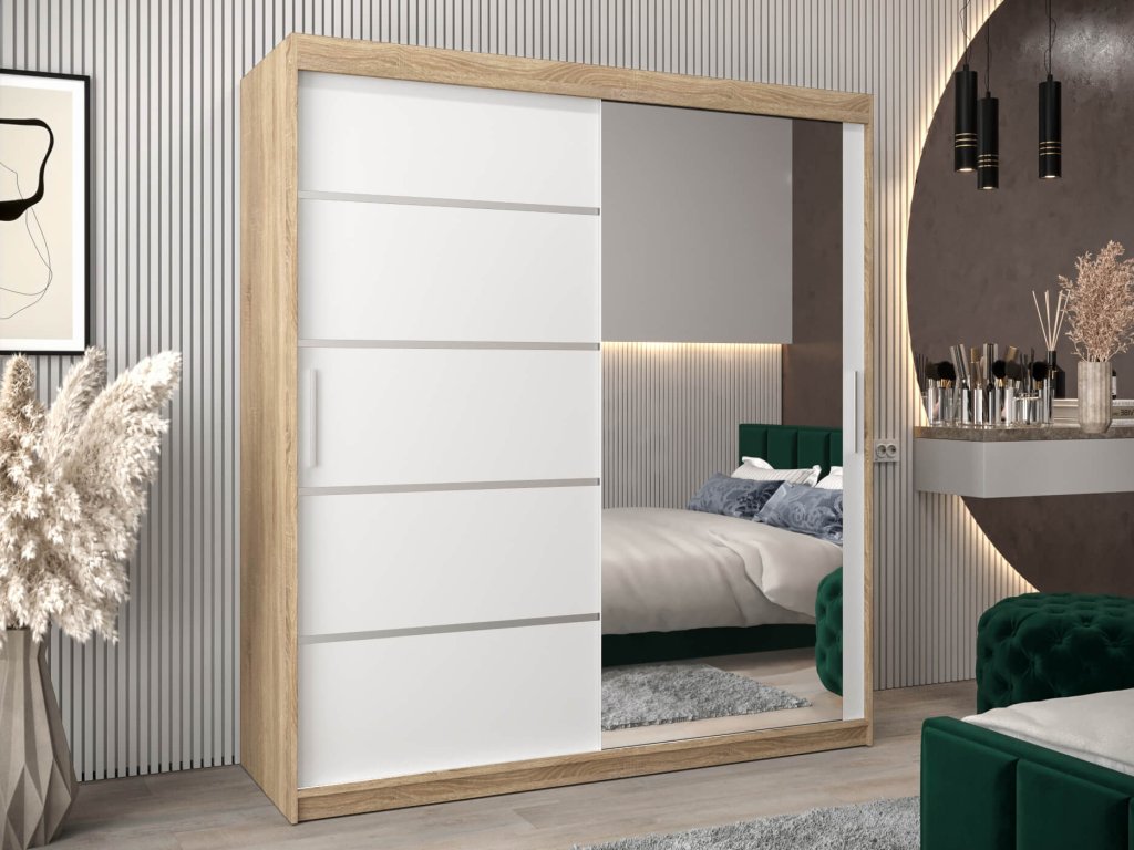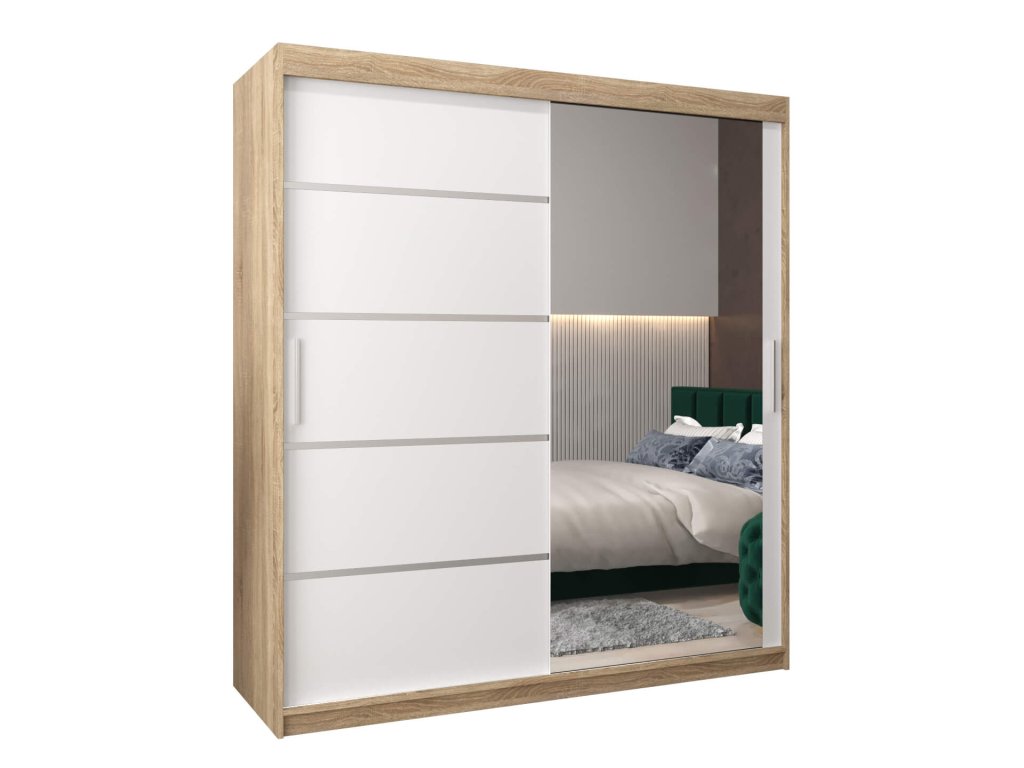 Széles és tágas ALYXIA 180/200 gardróbszekrény tükörrel sonoma tölgy és fehér szín kombinációjában készült. A szekrény minőségi 16 mm vastag laminált bútorlapból (DTD) készül, amely ellenálló a karcolásokkal, a nedvességgel és a magas hőmérséklettel szemben. A szekrény szélei ABS élzárással vannak biztosítva. Az ajtók kényelmes kinyitását és becsukását a ,,BIMAK” tolóajtó rendszer biztosítja (fémsíneken). A szekrény három részre van osztva. A ruhásszekrény közepén a két akasztórúd elegendő tárolóhelyet biztosít, a jobb és a bal szélében lévő négy polc pedig áttekinthetővé teszi a ruhákat. A modern gardróbszekrény tökéletes választás a hálószobába, a folyosóra vagy az előszobába is.