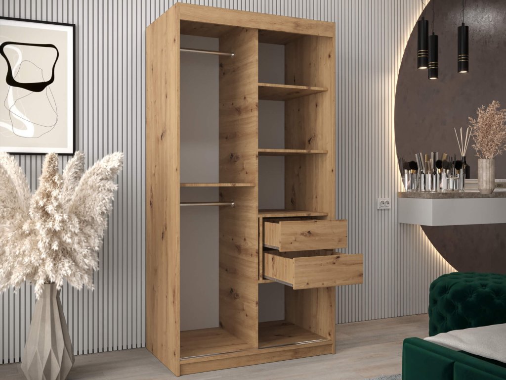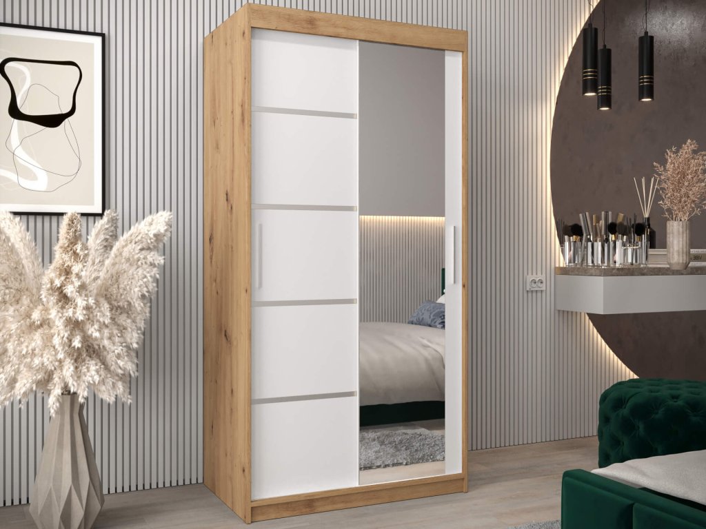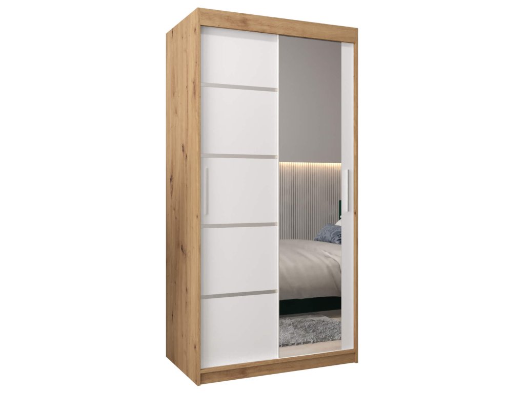 Tükrös ALYXIA II 100/200 artisan tölgy - fehér tolóajtós ruhásszekrény, amely minőségi 16 mm vastag laminált bútorlapból (DTD) készül, amely ellenálló a karcolásokkal, a nedvességgel és a magas hőmérséklettel szemben. A szekrény szélei ABS élzárással vannak biztosítva. Az ajtók kényelmes kinyitását és becsukását a ,,BIMAK” tolóajtó rendszer biztosítja (fémsíneken). A szekrény bal oldalán a két akasztórúd elegendő tárolóhelyet biztosít, a jobb oldalon lévő négy polc pedig áttekinthetővé teszi a ruhákat. A modern gardróbszekrény tökéletes választás a hálószobába, a folyosóra vagy az előszobába is.