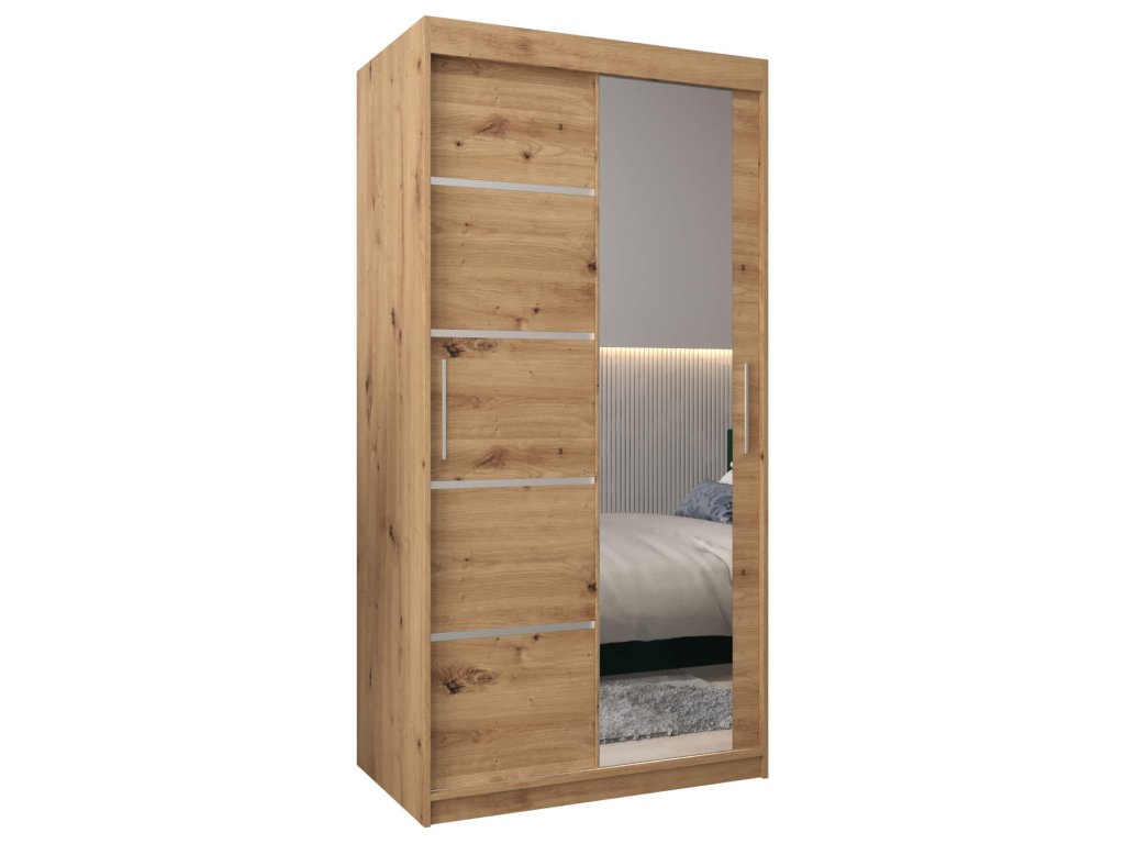 Artisan tölgy színű tükrös ALYXIA II 100/200 tolóajtós ruhásszekrény, amely minőségi 16 mm vastag laminált bútorlapból (DTD) készül, amely ellenálló a karcolásokkal, a nedvességgel és a magas hőmérséklettel szemben. A szekrény szélei ABS élzárással vannak biztosítva. Az ajtók kényelmes kinyitását és becsukását a ,,BIMAK” tolóajtó rendszer biztosítja (fémsíneken). A szekrény bal oldalán a két akasztórúd elegendő tároló helyet biztosít, a jobb oldalon lévő négy polc pedig áttekinthetővé teszi a ruhákat. A modern gardróbszekrény tökéletes választás a hálószobába, a folyosóra vagy az előszobába is.