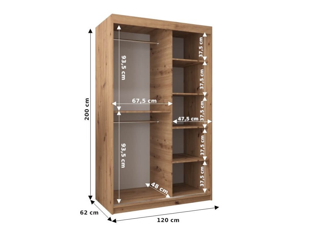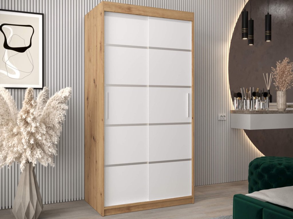 ALYXIA 100/200 artisan tölgy - fehér ruhásszekrény, amely minőségi 16 mm vastag laminált bútorlapból (DTD) készül, amely ellenálló a karcolásokkal, a nedvességgel és a magas hőmérséklettel szemben. A szekrény szélei ABS élzárással vannak biztosítva. Az ajtók kényelmes kinyitását és becsukását a ,,BIMAK” tolóajtó rendszer biztosítja (fémsíneken). A szekrény bal oldalán a két akasztórúd elegendő tárolóhelyet biztosít, a jobb oldalon lévő négy polc pedig áttekinthetővé teszi a ruhákat. A modern gardróbszekrény tökéletes választás a hálószobába, a folyosóra vagy az előszobába is.