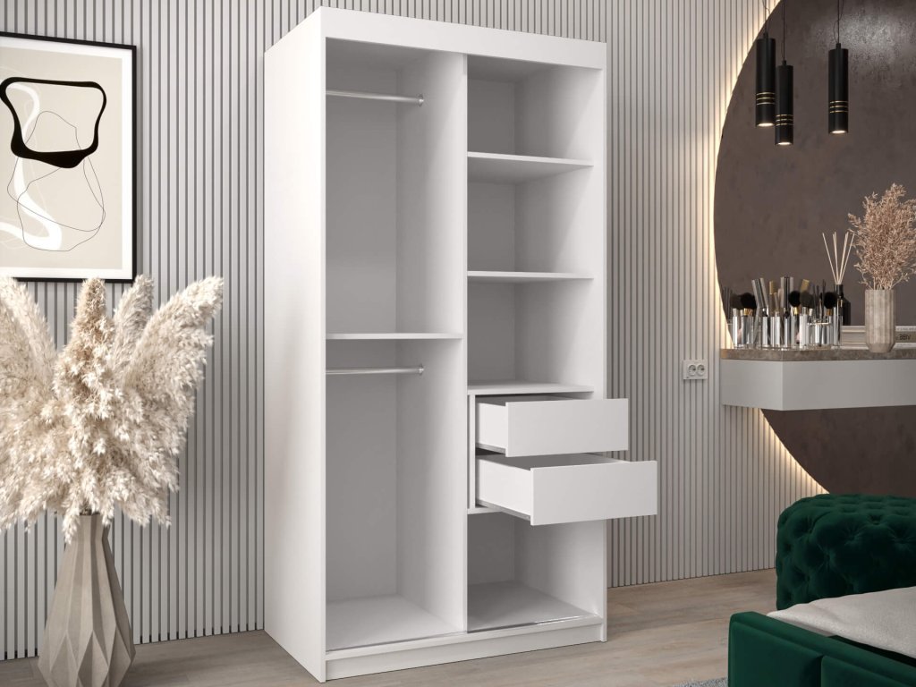 ALYXIA 100/200 fehér / sonoma tölgy ruhásszekrény, amely minőségi 16 mm vastag laminált bútorlapból (DTD) készül, amely ellenálló a karcolásokkal, a nedvességgel és a magas hőmérséklettel szemben. A szekrény szélei ABS élzárással vannak biztosítva. Az ajtók kényelmes kinyitását és becsukását a ,,BIMAK” tolóajtó rendszer biztosítja (fémsíneken). A szekrény bal oldalán a két akasztórúd elegendő tárolóhelyet biztosít, a jobb oldalon lévő négy polc pedig áttekinthetővé teszi a ruhákat. A modern gardróbszekrény tökéletes választás a hálószobába, a folyosóra vagy az előszobába is.