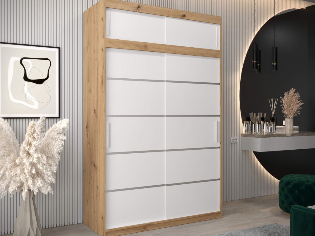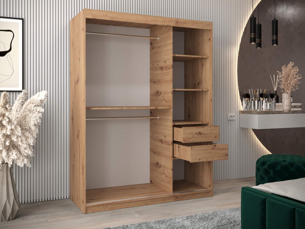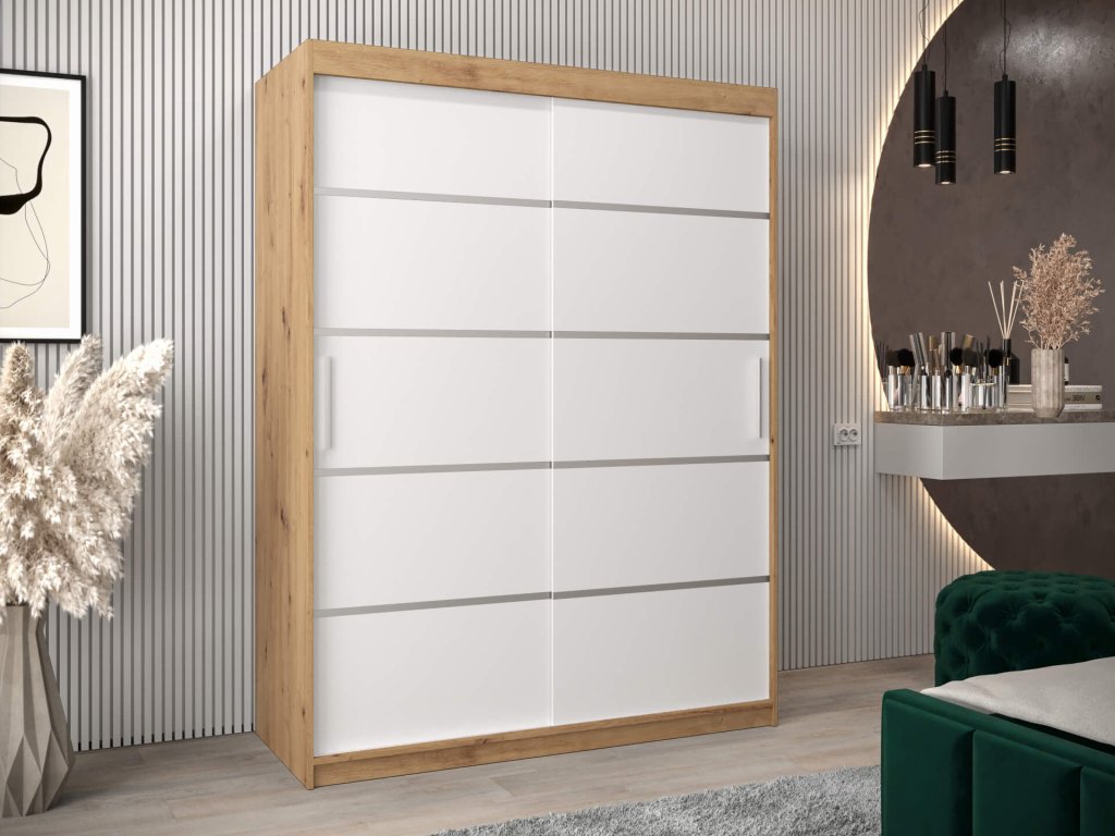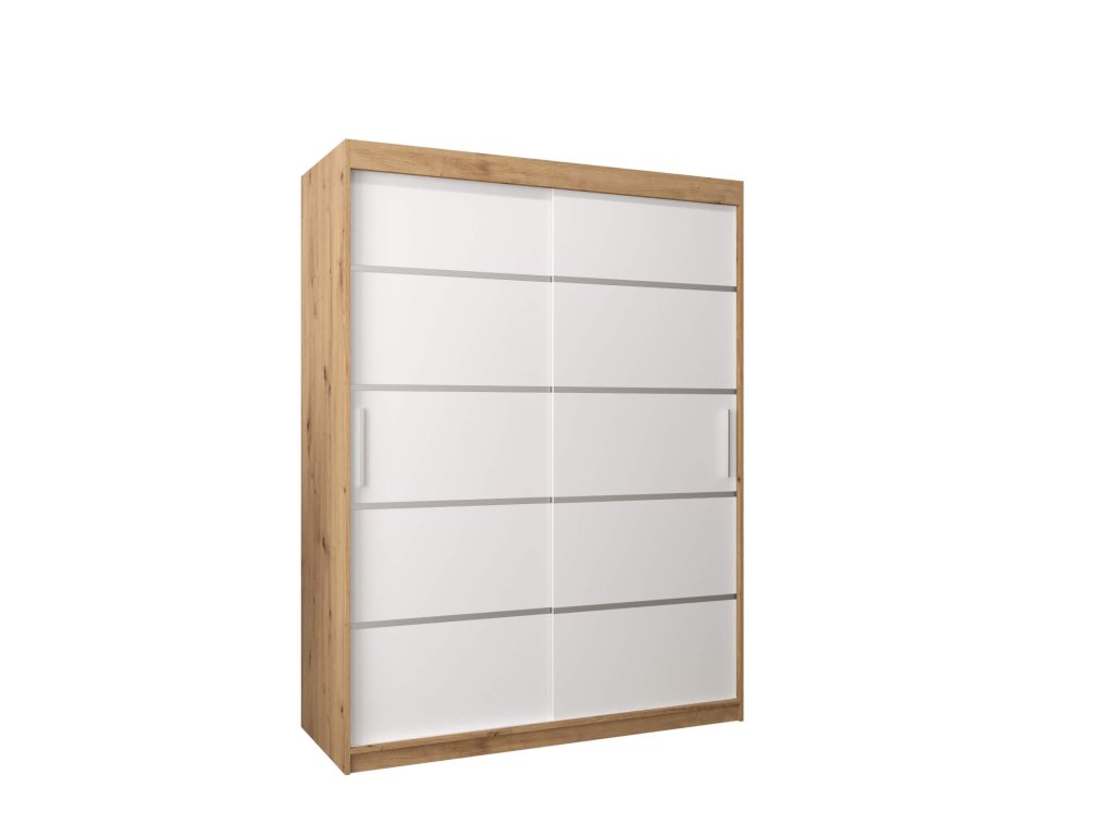 ALYXIA 150 artisan tölgy és fehér szín kombinációjában készült ruhásszekrény, amely minőségi 16 mm vastag laminált bútorlapból (DTD) készül, amely ellenálló a karcolásokkal, a nedvességgel és a magas hőmérséklettel szemben. A szekrény szélei ABS élzárással vannak biztosítva. Az ajtók kényelmes kinyitását és becsukását a ,,BIMAK” tolóajtó rendszer biztosítja (fémsíneken). A szekrény bal oldalán a két akasztórúd elegendő tárolóhelyet biztosít, a jobb oldalon lévő négy polc pedig áttekinthetővé teszi a ruhákat. A modern gardróbszekrény tökéletes választás a hálószobába, a folyosóra vagy az előszobába is.