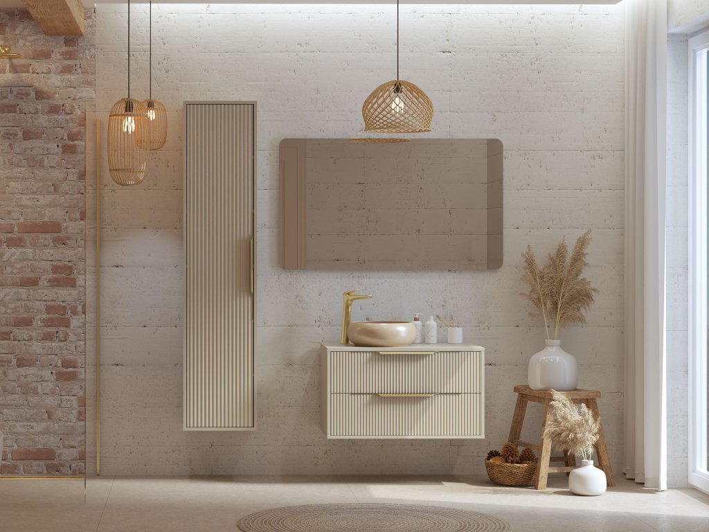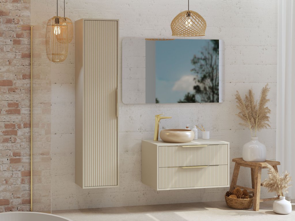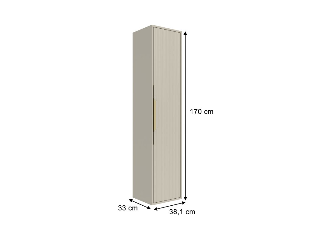 A gyönyörű és modern kasmír színű AMIRA fürdőszobai szekrény bőséges tárolóhelyet kínál. Ez a magas szekrény minőségi anyagokból – forgácslapból és MDF bútorlapból – készült, ellenálló ABS élzárással kiegészítve. Az ajtó elülső oldalán bordázott felület található, amely a szálcsiszolt arany színű fogantyúval modern és időtálló hatást kelt. A szekrény belsejében öt praktikus polc található, amelyek elegendő helyet biztosítanak például törölközők, kozmetikumok vagy tisztítószerek tárolására. A szekrény előnye, hogy falra is szerelhető, így helyet takarít meg a fürdőszobában. Emellett halk záródással rendelkező pántokkal van ellátva, amelyek biztosítják a csendes és kényelmes használatot. Az ajtó univerzálisan felszerelhető, azaz jobbos vagy balos nyitással.