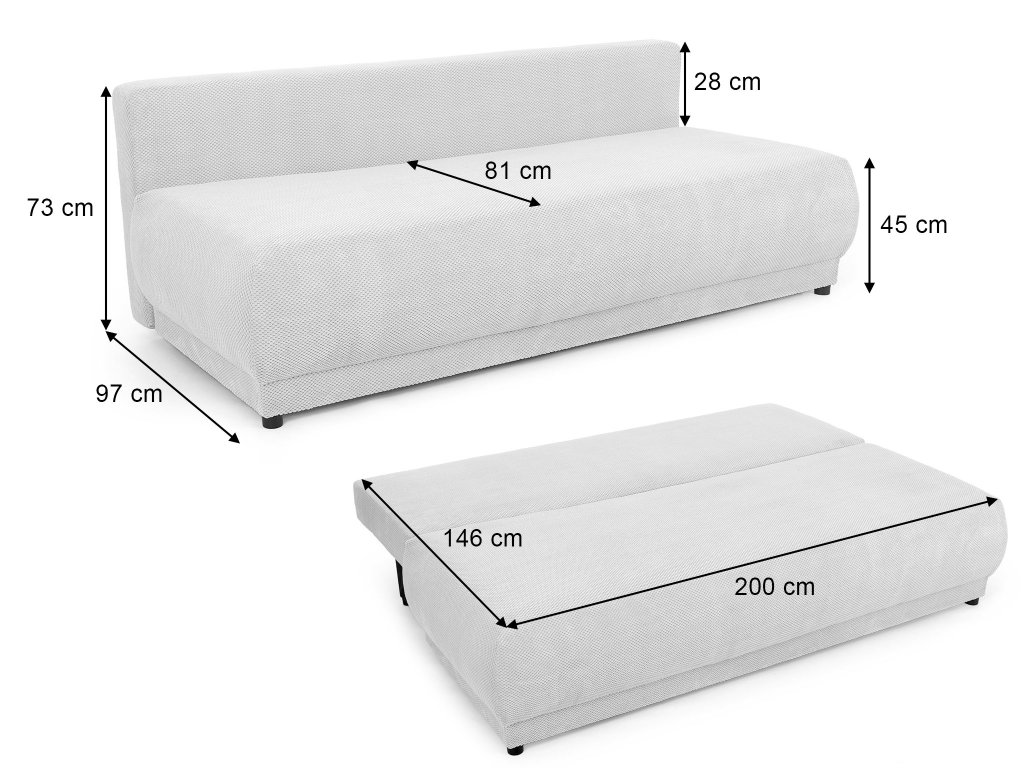- Anyaga: Onega 23 szövettel kárpitozva, Bonell rugók, T30-as poliuretán hab, tömör borovi fenyő, bútorlap, műanyag lábak