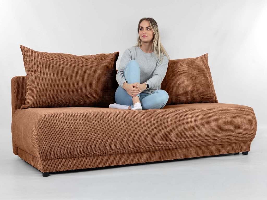 Gyönyörű és minőségi téglavörös ANDER kanapéágy, amely praktikus ágyneműtartóval és lábakkal is rendelkezik. Nagyon jó választás lehet a nappalijába vagy a vendégszobába is. Bézs Onega szövettel kárpitozott, amely vízlepergető és pet-friendly (állatbarát) tulajdonságokkal rendelkezik. Ez a minőségi poliészter szövet igazán puha tapintású, a bársonyos (velúr) plüssre emlékeztet. Az ülőfelület tömör fából és bútorlapból készült szerkezete Bonell rugókkal és T30-as habbal egészül ki, ami kényelmes, közepesen kemény felületet biztosít. A háttámla szintén T30-as habbal készült, amely gondoskodik a gerinc optimális megtámasztásáról, így hosszabb ülésnél is kellemes komfortot nyújt.