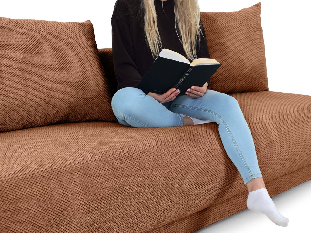 Ez az ágyazható kanapé nemcsak szép, de igazán praktikus is. A könnyen kezelhető kihúzható funkciónak (mechanizmusnak) hála néhány mozdulattal kényelmes ággyá alakítható, amely tökéletes szolgálatot tehet vendégek érkezésekor. A tágas ágyneműtartóban helyet kaphatnak a takarók, párnák vagy az ágyneműhuzatok is. A kanapéhoz tartozó négy díszpárna – két nagyobb és két kisebb – tovább növeli a kényelmet, és még otthonosabbá teszi az összképet.