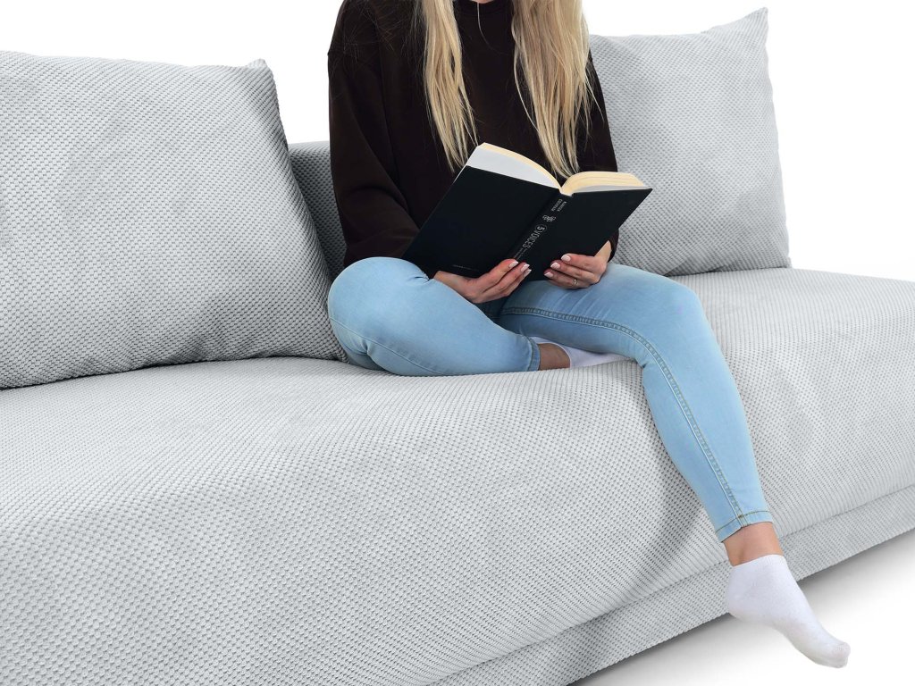 Az elegáns világosszürke ANDER ágyneműtartós kanapéágy egy igazán stílusos és modern bútordarab, amely biztosítja majd a kényelmét. Tökéletes harmóniát visz a nappalijába vagy a vendégszobába. Világosszürke Onega szövettel kárpitozott, amely vízlepergető és pet-friendly (állatbarát) tulajdonságokkal rendelkezik. Ez a minőségi poliészter szövet igazán puha tapintású, a bársonyos (velúr) plüssre emlékeztet. Az ülőfelület tömör fából és bútorlapból készült szerkezete Bonell rugókkal és T30-as habbal egészül ki, ami kényelmes, közepesen kemény felületet biztosít. A háttámla szintén T30-as habbal készült, amely gondoskodik a gerinc optimális megtámasztásáról, így hosszabb ülésnél is kellemes komfortot nyújt.