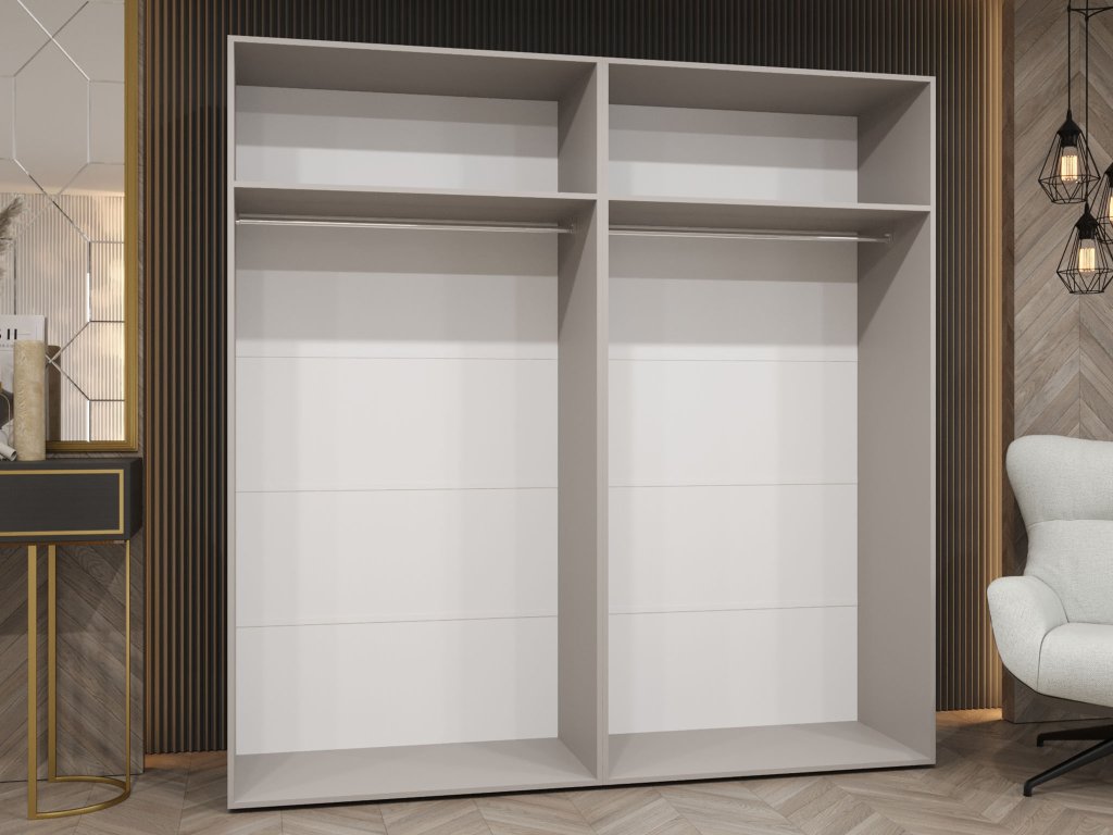 A szekrény korpusza tartós 16 mm vastag laminált lapból készült, élei pedig 0,5 mm-es PVC éllel védettek a hosszú élettartam érdekében. A belső tér fém akasztórudakat tartalmaz ruhák felakasztásához és tartósan csavarozott polcokat a dolgok stabil és áttekinthető tárolásához. A szárnyas ajtók halk záródással csendes, sima mozgást kínálnak. A gardrób további polcokkal bővíthető egyéni igények szerint, a hátsó HDF lemez és erős excentrikus kötések pedig szilárdságot és megbízhatóságot garantálnak. A 200 cm-es szélesség bőséges helyet kínál a komfortos napi használathoz és ruharendezéshez.