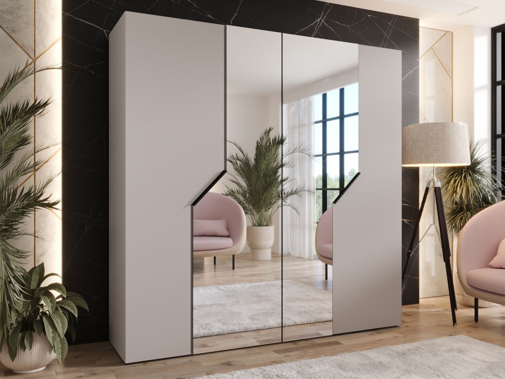 Az Andrew 2 gardróbszekrény finom kasmír árnyalatban különleges otthonos és luxus érzést hoz az enteriőrbe. Ez a meleg, semleges tónus a precíz CNC marással készült ajtólapokkal látványos vizuális remekművet alkot, amely könnyedén illeszkedik modern és klasszikus lakberendezési stílusokhoz. A központi csiszolt tükör nem csupán megvilágítja a teret, hanem mélységet is ad neki. A design karakterét a ferde fogantyúk egészítik ki, amelyek kiemelik a 200 cm széles domináns elem minimalistább vonásait. Ez a trendi kasmír dekor nyugtató energiát sugároz, és sokoldalúságának köszönhetően nemcsak hálószobába, hanem reprezentatív nappaliba vagy forgalmas előszobába is stílusos kiegészítő lesz.