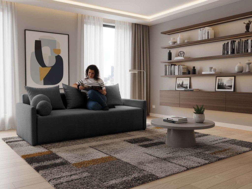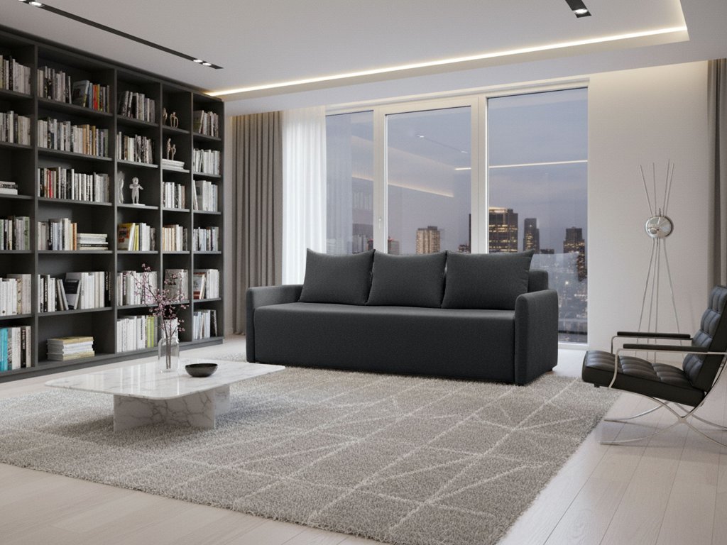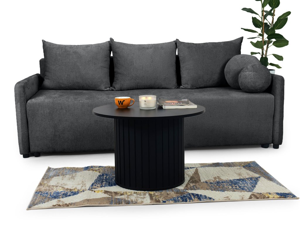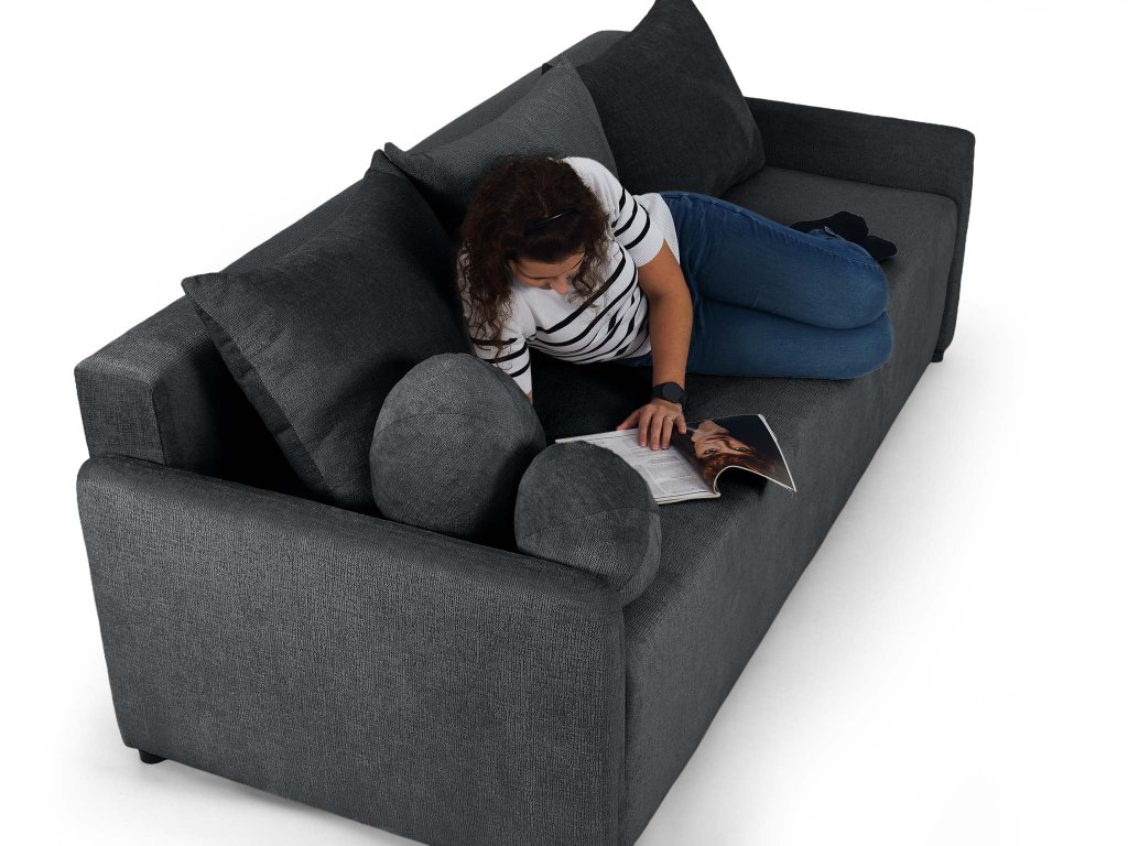 Az Apulia kanapéágyat úgy tervezték, hogy a mindennapokban is a lehető legpraktikusabb legyen. Az automata mechanizmusnak köszönhetően egyetlen mozdulattal ággyá alakítható, amelyet biztosan értékelni fog vendégek érkezésekor. Az ülőrész alatt pedig tágas ágyneműtartó kapott helyet. A Perfect Harmony sötétszürke szövet, amellyel a kanapéágy kárpitozott egy minőségi kárpitszövet, amely kellemes tapintású, rendkívül ellenálló a kikopással szemen és könnyen tisztítható. Ezeknek a tulajdonságoknak köszönhetően az Apulia hosszú időn át megőrzi majd szépségét és kényelmességét. A két kerek díszpárna is a csomagolás részét képezi.