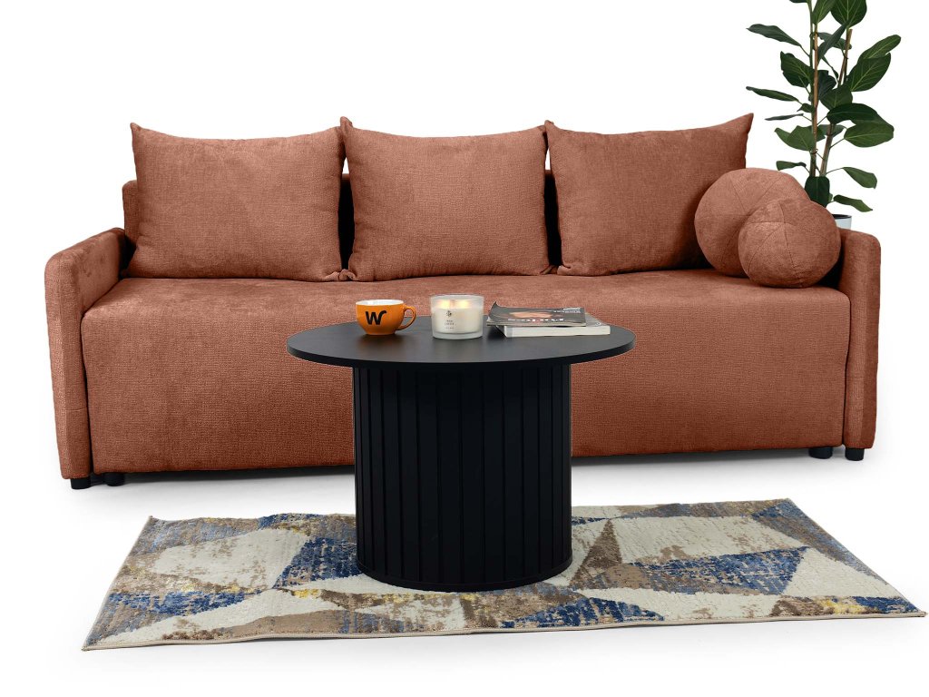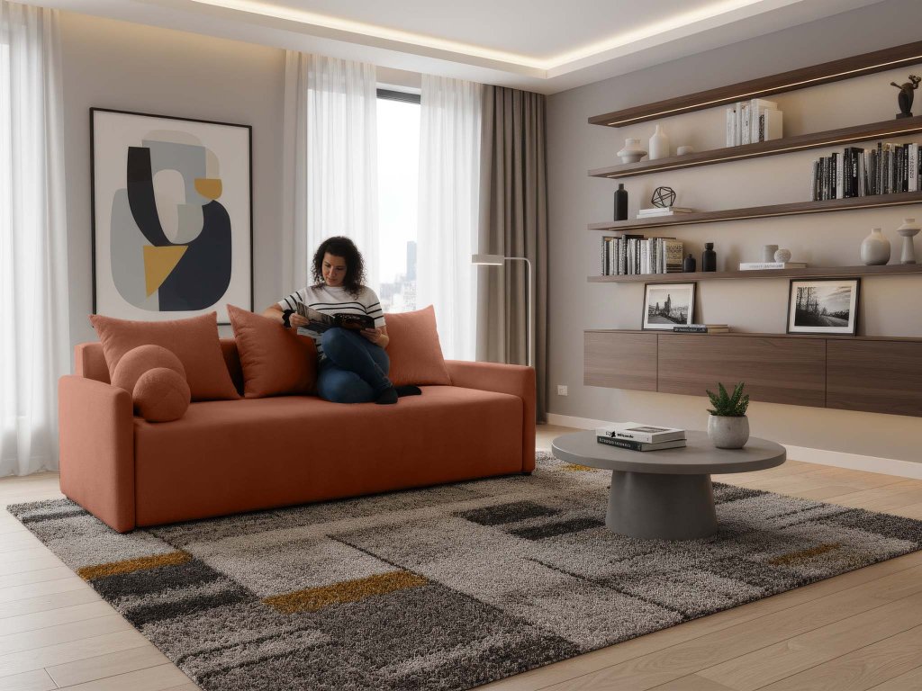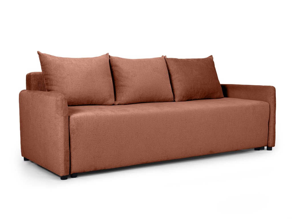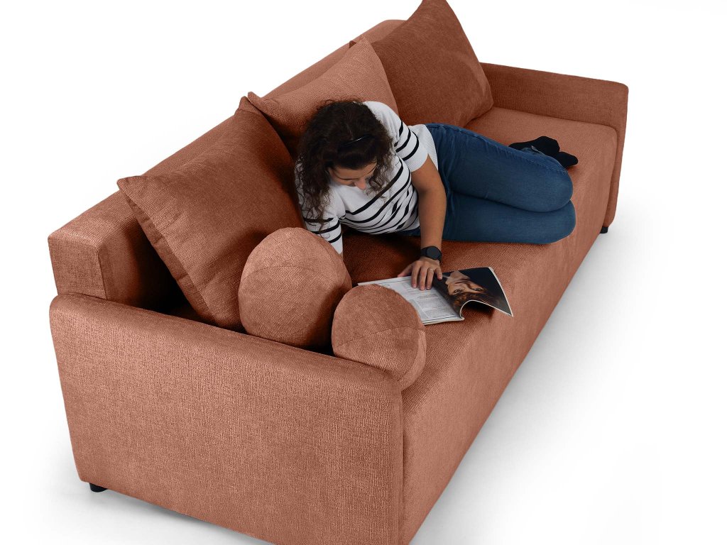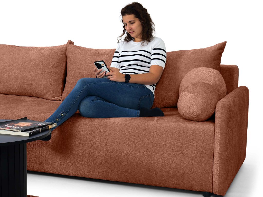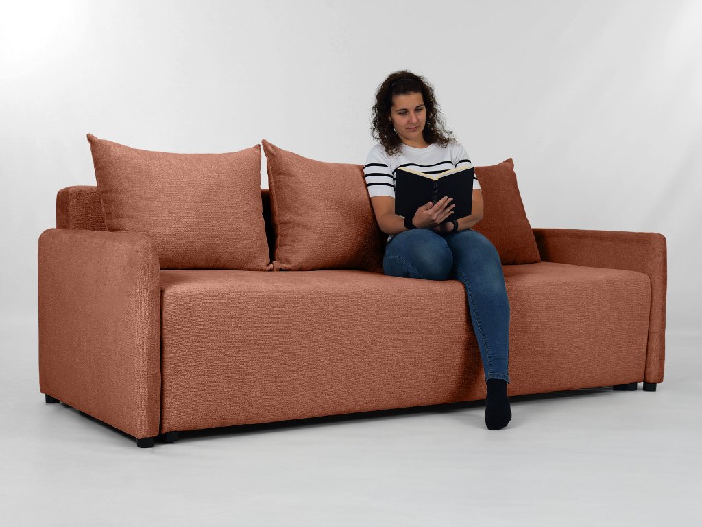 Az Apulia kanapéágyat úgy tervezték, hogy a mindennapokban is a lehető legpraktikusabb legyen. Az automata mechanizmusnak köszönhetően egyetlen mozdulattal ággyá alakítható, amelyet biztosan értékelni fog vendégek érkezésekor. Az ülőrész alatt pedig tágas ágyneműtartó kapott helyet. A Perfect Harmony téglavörös szövet, amellyel a kanapéágy kárpitozott egy minőségi kárpitszövet, amely kellemes tapintású, rendkívül ellenálló a kikopással szemen és könnyen tisztítható. Ezeknek a tulajdonságoknak köszönhetően az Apulia hosszú időn át megőrzi majd szépségét és kényelmességét. A két kerek díszpárna is a csomagolás részét képezi.