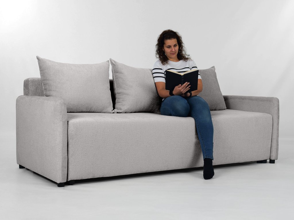 Az APULIA ágyazható kanapé minimalista, letisztult formájával azonnal felhívja magára a figyelmet. Bármely otthonban remekül mutat – legyen szó modern, klasszikus vagy skandináv stílusú lakásokról is. A kanapéágy világosszürke szövettel kárpitozott, amely friss, harmonikus megjelenést kölcsönöz a bútornak. Ez a szín könnyen kombinálható más színekkel és kiegészítőkkel. A Harmony szövet nagyon kellemes tapintású és finom textúrával rendelkezik, amelyet biztosan értékelni fog a mindennapok során. A három puha háttámlapárna még nagyobb kényelmet garantál. Az ágynemátartós kanapé hosszú élettartamát a tömör fából és forgácslapból készült stabil váza garantálja, míg a Bonell rugók és a T30-as hab tökéletes egyensúlyt teremtenek a kényelem és az alátámasztás között. A visszafogott fekete műanyag lábak diszkréten egészítik ki a dizájnt.