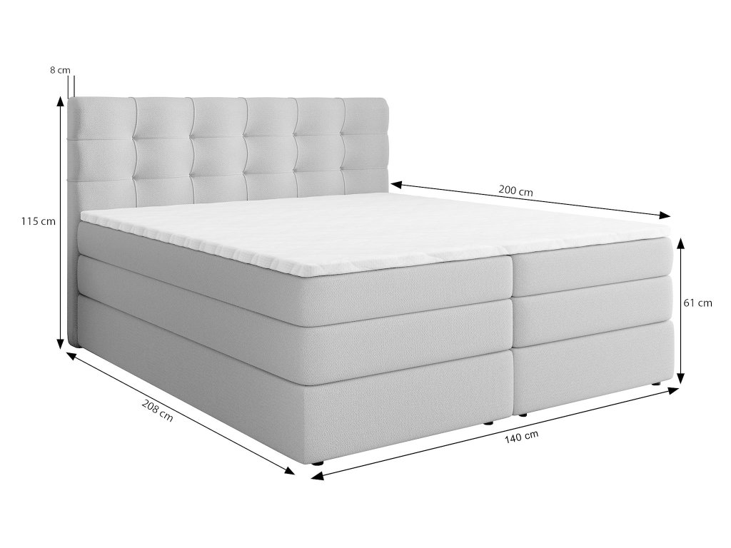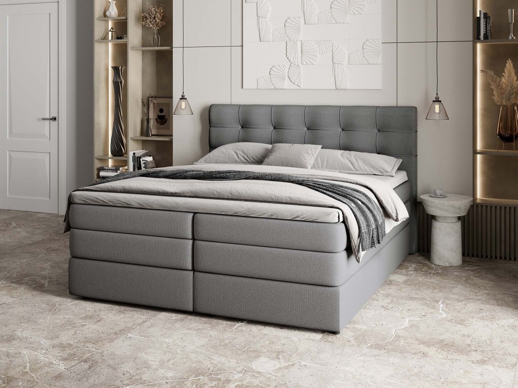 Az AREZI boxspring ágy 140x200 cm gyönyörű szürke szövettel kárpitozva otthona domonáns eleme lesz. Ez egy időtálló bútordarab, amely minden stílusú hálószobába megfelelő lehet. A precíz megtervezésnek és a stabil szerkezetének köszönhetően egy igazán gyönyörű és esztétikus ágyat kap, amely első látásra lenyűgöz majd mindenkit. A modern design, a klasszikus anyagok és a nem mindennapi matracok teszik az Arezi ágyat tökéletes választássá mindazok számára, akik kompromisszumot keresnek a kényelem és a szép megjelenés között.