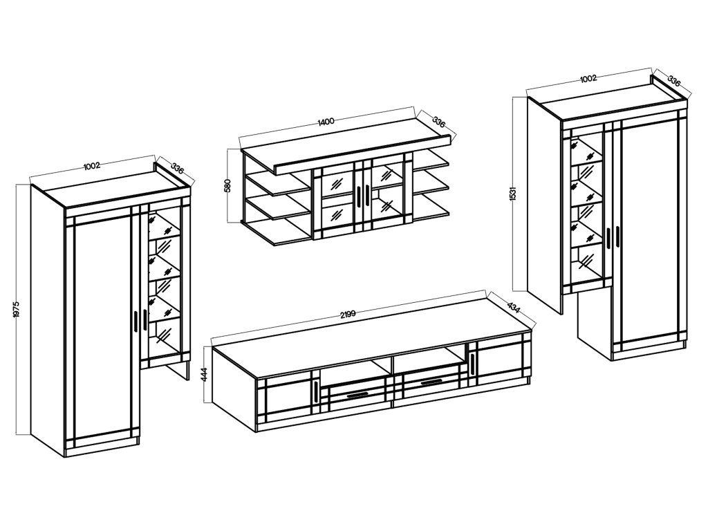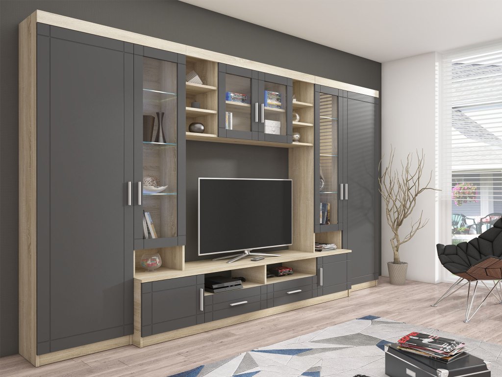 A stílusos és praktikus ARIS egybefüggő szürke szekrénysor tökéletes választás a nappaliba. Ez a nappali fal szürke színben készül, amely igazán modern hatást kelt. Számos tárolóhelyet biztosít a méretének köszönhetően. A szekrénysor szekrényekből, vitrinekből, nyitott polcokból és tévés szekrényből tevődik össze. Tartalmaz 2 darab fiókot is. A vitrines ajtók 4 mm vastag üvegből készülnek, míg a vitrinekben 5 mm vastag üvegpolcok találhatók. A vitrinekbe elhelyezheti a családi fényképeket vagy egyéb dísztárgyakat. A ezüst színű műanyag fogantyúk elegáns és egyben modern hatást kölcsönöznek a bútornak.