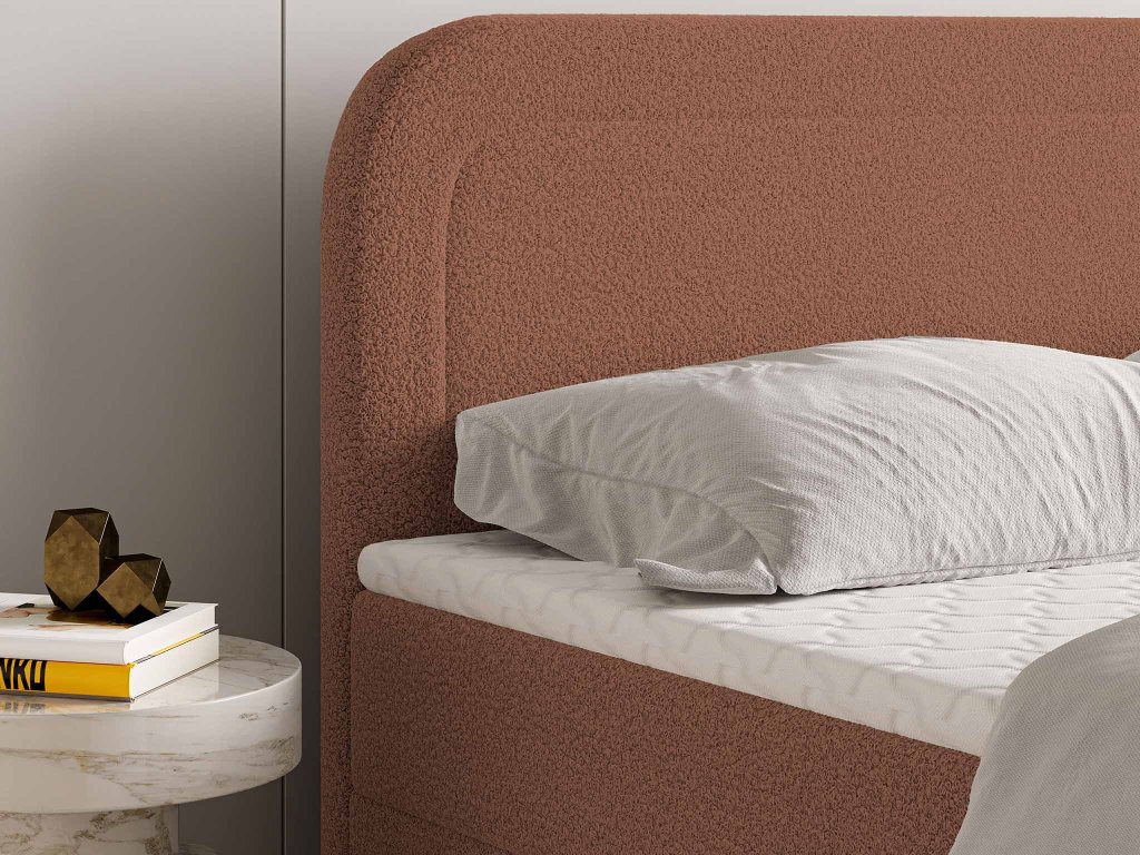 Az ARMELIN boxspring ágy 140x200 cm téglavörös szövettel kárpitozva egy különleges bútordarab. Ez egy igazán elegáns kontinentális ágy, amely magas fokú kényelmet, praktikus funkciókat és hosszú élettartamot garantál. Minden részlete tökéletesen kidolgozott, ráadásul tartalmaz mindent, ami egy modern ágytól elvárható: ágyneműtartót, magas puha steppelt háttámlát, matracokat és lábakat is.