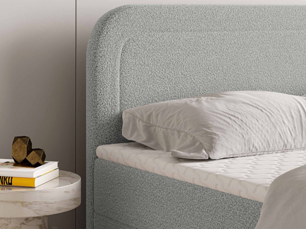 Az amerikai stílusú ágy Now or Never szövettel kárpitozott, amely modern megjelenéssel és praktikus tulajdonságokkal rendelkezik. A Now or Never szövettel kárpitszövet egy buklé (bouclé) típusú szövet, amely egy kellemes tapintású és puha “báránykás” anyag. Nagyon ellenálló a bolyhozódással és a kikopással szemben, továbbá könnyen tisztítható és kíméletes a környezethez is, ugyanis újrahasznosított anyagokat is tartalmaz. Az ágy a lekerekített formáinak és a gyönyörű kárpitozásának köszönhetően nagyon otthonos és meleg hatást kelt.