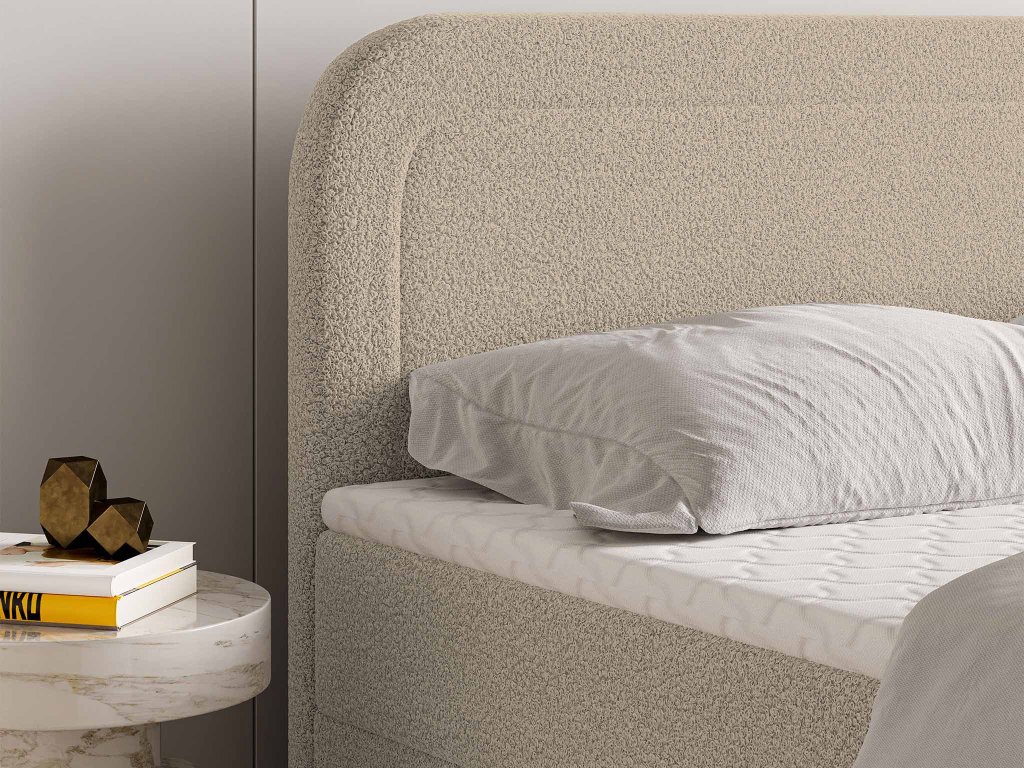 Az amerikai stílusú ágy Now or Never szövettel kárpitozott, amely modern megjelenéssel és praktikus tulajdonságokkal rendelkezik. A Now or Never szövettel kárpitszövet egy buklé (bouclé) típusú szövet, amely egy kellemes tapintású és puha “báránykás” anyag. Nagyon ellenálló a bolyhozódással és a kikopással szemben, továbbá könnyen tisztítható és kíméletes a környezethez is, ugyanis újrahasznosított anyagokat is tartalmaz. Az ágy a lekerekített formáinak és a gyönyörű kárpitozásának köszönhetően nagyon otthonos és meleg hatást kelt.