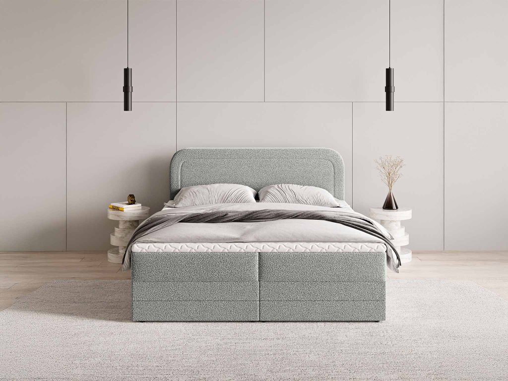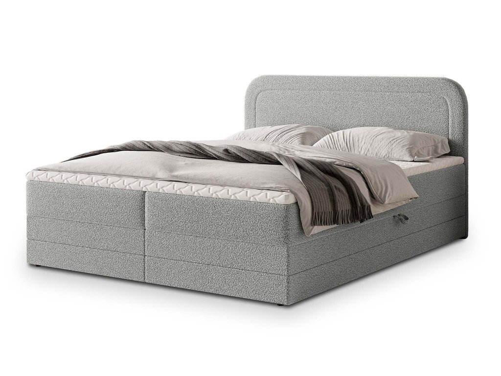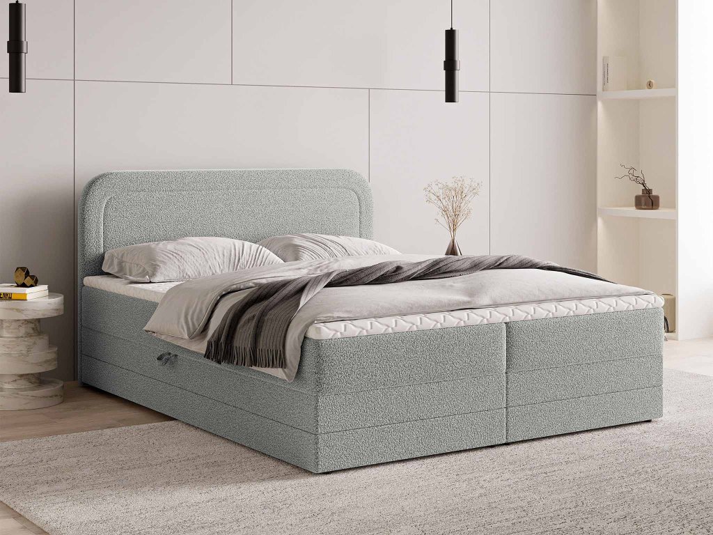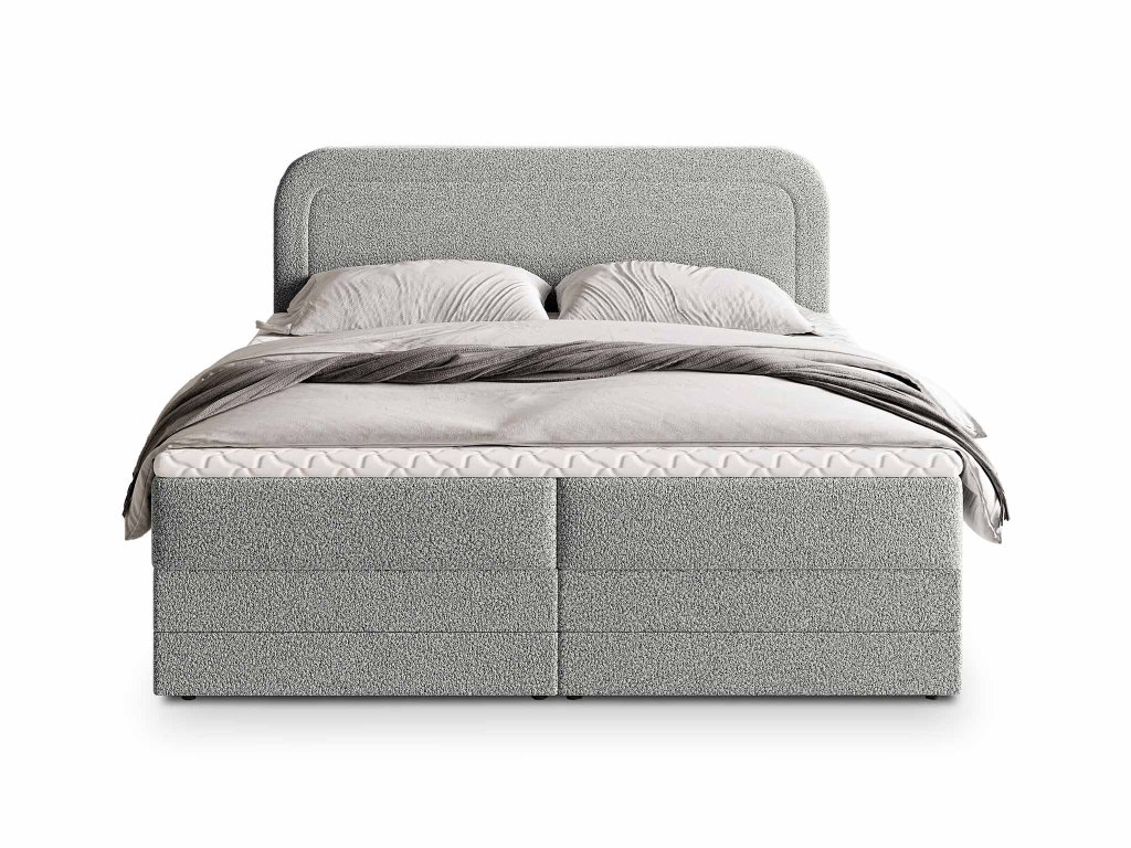 Elegáns nagy méretű ARMELIN boxspring ágy 160x200 cm világosszürke bouclé szövettel kárpitozva. Ez egy igazán elegáns kontinentális ágy, amely magas fokú kényelmet, praktikus funkciókat és hosszú élettartamot garantál. Minden részlete tökéletesen kidolgozott, ráadásul tartalmaz mindent, ami egy modern ágytól elvárható: ágyneműtartót, magas puha steppelt háttámlát, matracokat és lábakat is.