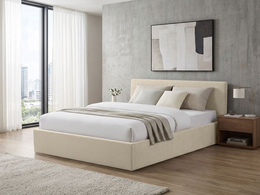 - Anyaga: MDF bútorlap szerkezet / felnyitható fém ágyrács keret / bouclé szövet