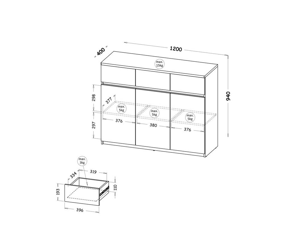 Az Arca 6 komód három praktikus fiókkal és három kis szekrénnyel rendelkezik, melyek mögött egy-egy polc található. A komód tetejére elhelyezhet fényképeket, dísztárgyakat, virágokat.