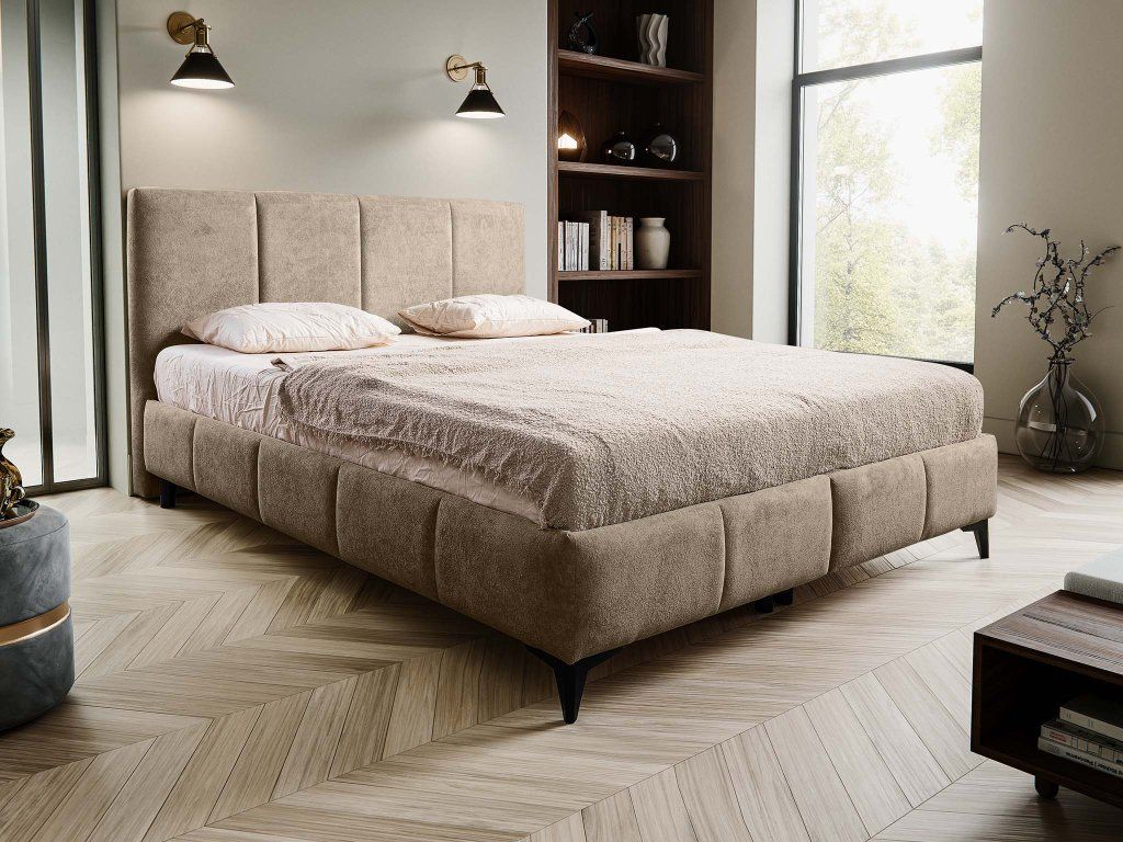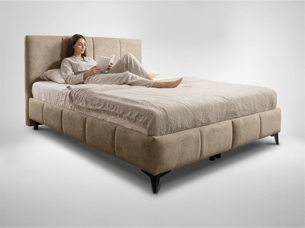 Ami ezt az ágyat minden érintésnél különlegessé teszi, az a prémium Monolith szövetkárpitozás. Ez a textil gyönyörűen veri vissza a fényt, és finom szaténos csillogást kölcsönöz a bútornak, ami az exkluzivitás jegyeit hordozza. A vásárlók különösen értékelni fogják, hogy az anyag felkészült a mindennapi élet kihívásaira – szálait speciális filmréteg védi, amely nem engedi át a folyadékot a mélybe. Bármilyen kiömlött víz vagy kávé elkülönült cseppeket alkot a felületen, amelyeket egyszerűen felitathat egy száraz törlőkendővel. Így az ágy higiénikusan tiszta, illatos és vizuálisan tökéletes marad a teljes élettartama alatt. A 12 cm magas lábak könnyedséget kölcsönöznek az ágynak, és lehetővé teszik a robotporszívó áthaladását.
