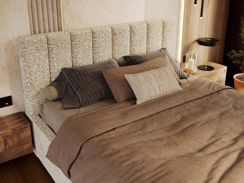 Egy igazu luxust kínáló franciaágyat keres, amelynek hála otthon is úgy érezheti magát mint egy 5 csillagos szállodában? Az AUSTIN II franciaágy 200x180 pont ilyen. Gyönyörű bouclé szövettel kárpitozott és a tágas ágyneműtartójának köszönhetően számos plusz tároló helyet biztosít. Az ágy részét képezi egy gázrugós emelőszerkezettel ellátott ágyrács, amely alatt praktikus ágyneműtartó található, így könnyen elhelyezhető benne az ágynemű, a szezonális ruhák vagy más használati tárgyak. Ezzel a megoldással hálószobában vagy a gyerekszobában is még több tároló helyhez jut majd. Az ágy szerkezete strapabíró, kiváló minőségű bútorlapból készült, amely könnyen tisztán tartható. A stabilitásról és a tartósságról pedig a megerősített illesztések és a rugalmas nyírfa lamellás ágyrács gondoskodik, amely optimális alátámasztást nyújt. Maximális kényelmet garantál egy hosszú, fárasztó nap után. A kellemes tapintású és finom krémszínű BOUCLE szövet elegáns megjelenést kölcsönöz a kárpitozott ágynak, miközben az anyag rendkívül ellenálló a sérülésekkel szemben. A csokoládékockákra emlékeztető steppelés különleges designt ad az ágynak.