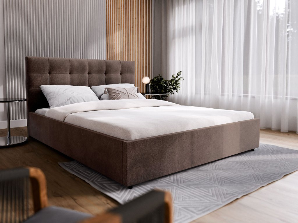 Az ágy kiváló minőségű Cosmic 800 anyagból készült, elegáns barna színben. Ez a textília sűrű szövéssel és finom lenhatással rendelkezik, ami a felületnek enyhén fényes és kellemes matt megjelenést kölcsönöz. Tapintásra puha és selymes, ugyanakkor elég tartós, hogy ellenálljon a mindennapi használatnak.