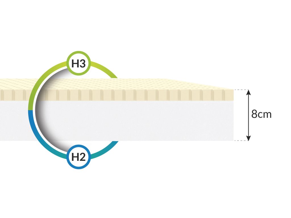 A magas minőségű 7 zónás profilozott hab biztosítja a megfelelő vérkeringést a bőr alatt és az izmok ellazulását alvás során. Hő hatására hozzáidomul a test formájához, így biztosítja a kellemes pihenést. A 7 keménységi zónának köszönhetően megfelelő alátámasztást nyújt a hátgerincnek és az egész testnek. Ez a hab allergiások számára is megfelelő.