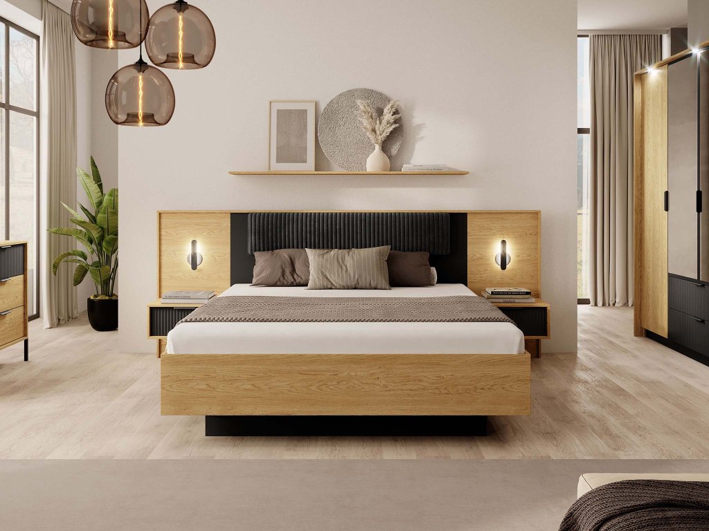 Alakítsa át hálószobáját a stílus és a kényelem jegyében a BALTIC hálószoba garnitúra segítségével, amely balti tölgy és fekete színek kombinációjában készül. Ez az elegáns bútorcsalád a modern designt és a minőségi anyagokat ötvözi. Ez a gyönyörű garnitúra fényűző luxust és egységes megjelenést kölcsönöz majd a hálószobának. A prémium minőségű anyagokból készült hálószoba szettet úgy tervezték, hogy ellenálló legyen a mindennapos használattal szemben, miközben megőrzi elegáns megjelenését. A bútor strapabíró, 16 mm vastag E05 laminált forgácslapból és 18 mm vastag MDF bútorlapból készült, ami stabil szerkezetet és hosszú élettartamot garantál. A bútorlap színében készült ABS furnér sima felületet biztosít, amely kellemes tapintású és ellenálló a sérülésekkel szemben.