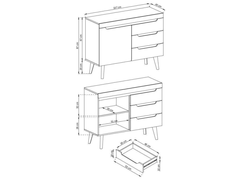 Nordi 107 artisan tölgy komód a méretei ellenére is számos tároló helyet kínál. 3 fiókkal és egy polccal rendelkezik az ajtó mögött.